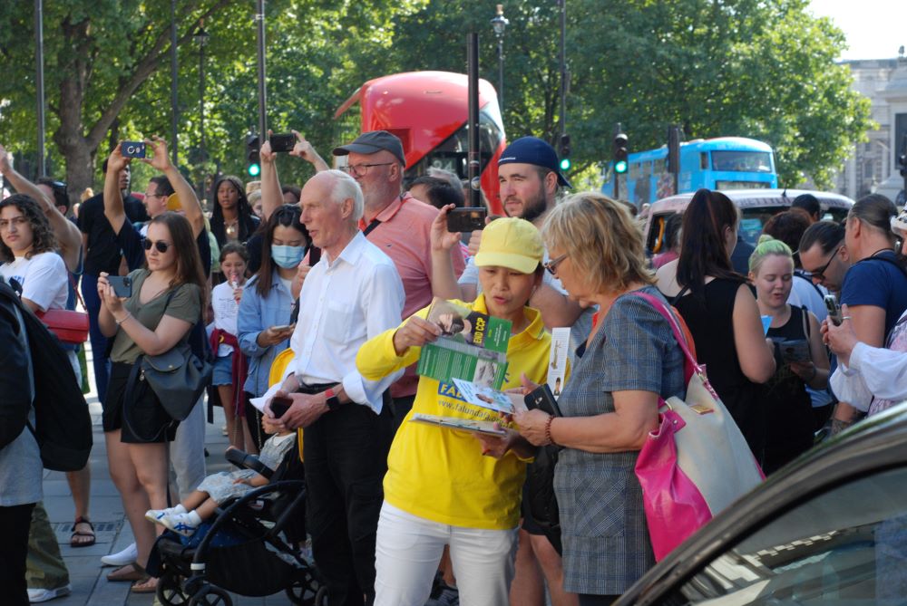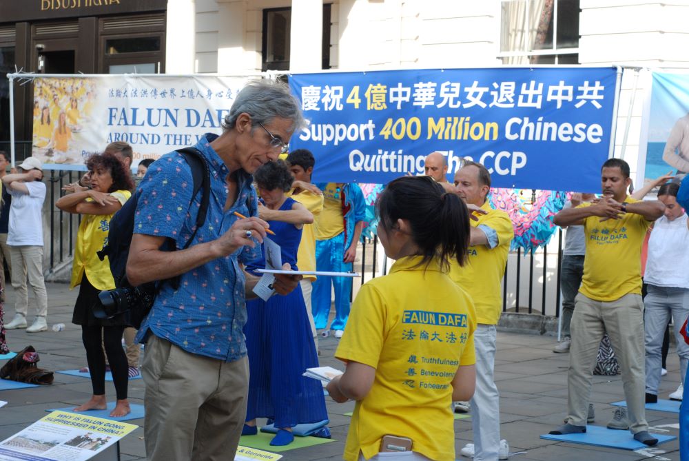 长期坚持在大英博物馆讲真相的梁女士也分享了一个故事:有位五十岁的中国男士走到桌前主动拿资料,交谈中得知他是位外科医生,我和他讲真相,他说我支持你们,共产党就是坏就是邪恶,八九年的六四我参加了,在大陆,这手机看不到真消息,他说,现在了解真相渠道也越来越多样化,在我看来,这三十年来,在所有追求民主自由的团体中,法轮功是做的最好的,因为你们有信仰。