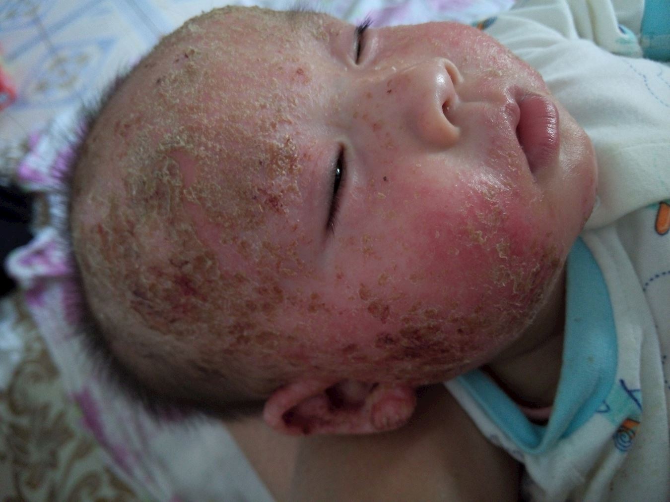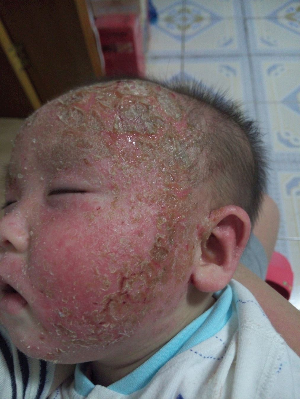 不让挠,孩子要哭,挠完了,也要哭。皮肤都挠烂了,一头的脓和血。脸上没有一块好的皮肤,甚至有时眼睛都被脓血粘着,难以睁开,双眼皮也不见了。给孩子照相时,根本对不上焦,因为孩子坐不住,不是手往头上挠,就是头往物体上蹭。如照片1、2、3(慎入),头上、脖子上都是,这还不是最烂的时候。最烂的时候,就像同修文章里的那张照片那样,黄色的、厚厚的结痂。