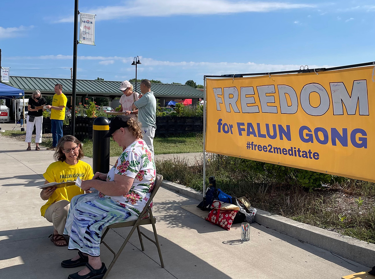 当天,在经历了几周的酷热之后,天气变得宜人。法轮功学员们在农贸市场入口处拉起了“还法轮功自由”的大横幅,许多路人驻足了解法轮功及其在中国遭迫害的情况。不少游客停下来,在敦促制止中共迫害法轮功和活摘器官罪行的请愿书上签名。