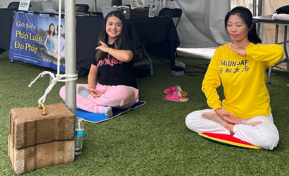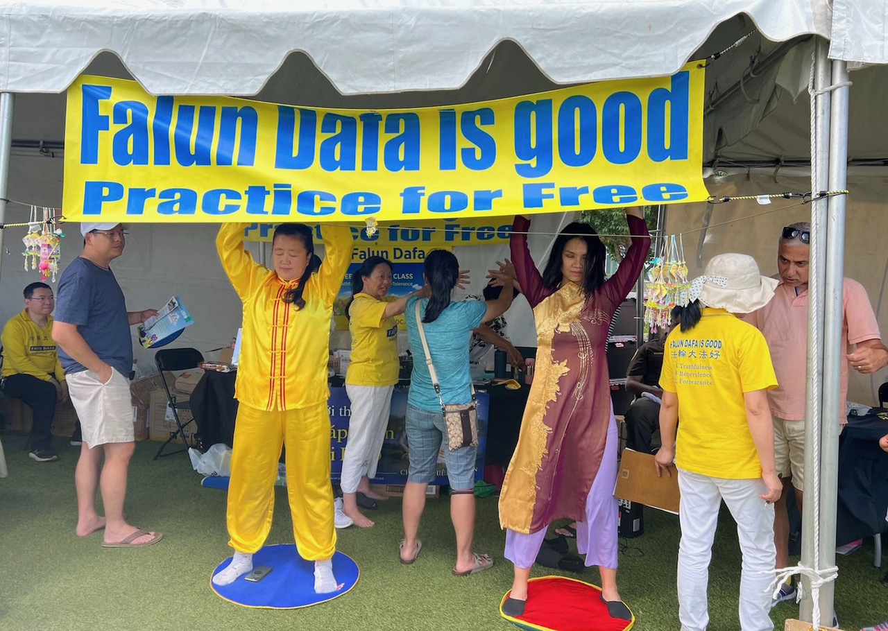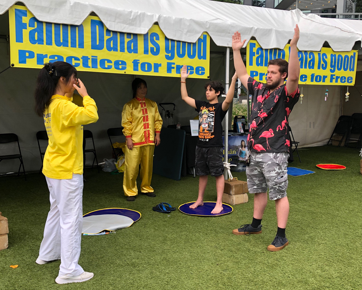 活动快要结束时,一位年轻的中国女孩走过来,直接说:“我要学法轮功。”并且自我介绍说自己才二十五岁,在美国压力很大,都有白头发了。所以,她想到要学法轮功。并且也得到国内母亲的支持。她是随公司来参加这次活动的,遇到学员们非常高兴。