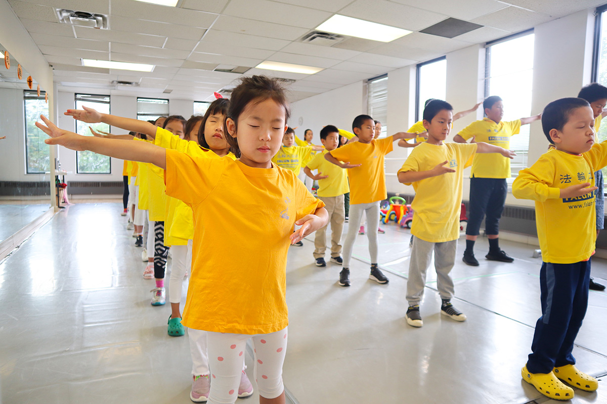 图1~2:多伦多明慧学校夏令营的法轮大法小弟子们参加每天的炼功