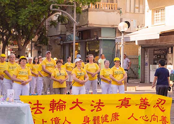 七月十六日,法轮大法学员抵达特拉维夫旧中央汽车站广场,打开“法轮大法 真善忍”的横幅,讲述法轮功的真相。