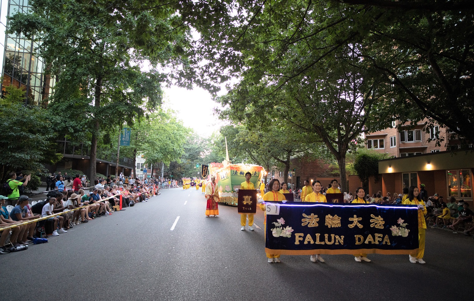 在来自不同地区,不同行业,不同族裔的八十多个团体中,代表华盛顿州法轮大法学会的游行队伍尤其引人注目。这是他们连续第十六年应邀参加游行,整个队伍由身着明黄色炼功服,打着绣有“真、善、忍,法轮大法”等字样横幅的当地大法学员、装饰着璀璨彩灯的大法船及西雅图-温哥华联合腰鼓队组成。