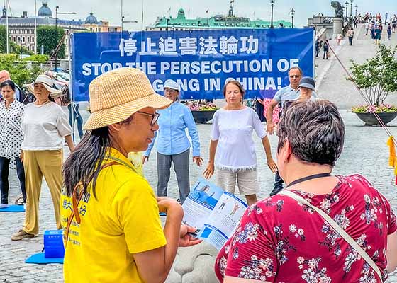 八月份的每个周五和周六下午,法轮功学员都在斯德哥尔摩市中心通往老城的钱币广场上,举办讲真相活动。学员向人们展示法轮功的五套功法。