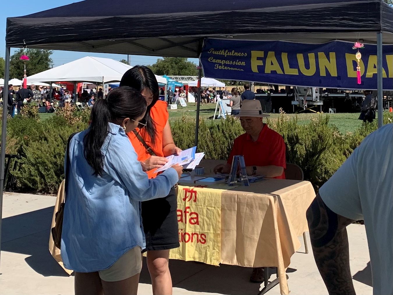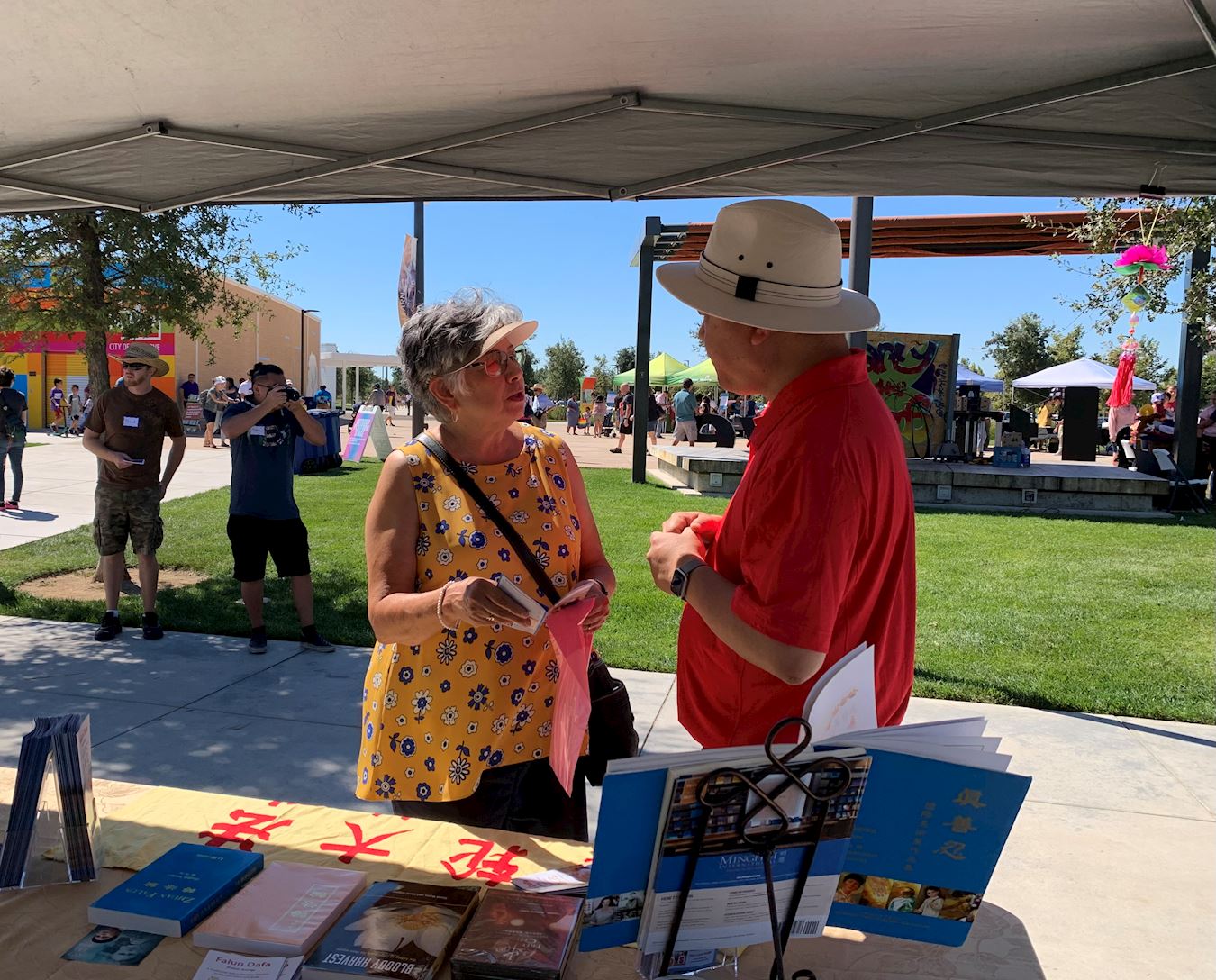 两位衣着优雅的白人中年女士看到法轮功的展位非常感兴趣。其中一位女士仔细地观看了桌子上展示的每一本书和资料。她说她喜欢中国文化,女婿还在中国当篮球教练。法轮功学员讲述了什么是法轮功,以及祛病健身的功效,使人身心受益。当讲到中共迫害法轮功的真相时,这位女士说她知道中共迫害人民,毁坏中国传统文化。她仔细询问了当地集体炼功的时间地点,表示要找时间来学功,还主动拿了展位上的各种英文资料,说要把资料和今天了解的信息告诉她的女婿,说她的女婿一定也想知道这些信息。