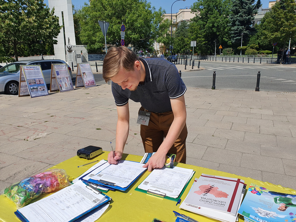 华沙的Dariusz先生观看展板后,走过来参加征签,他说:“共产党这么邪恶,不能让它再存在下去了,我永远支持你们。”