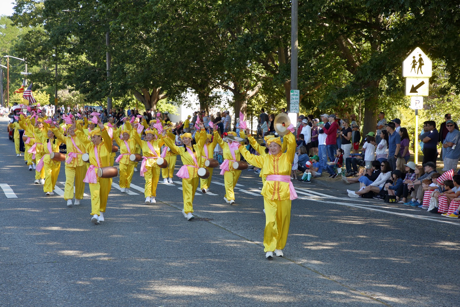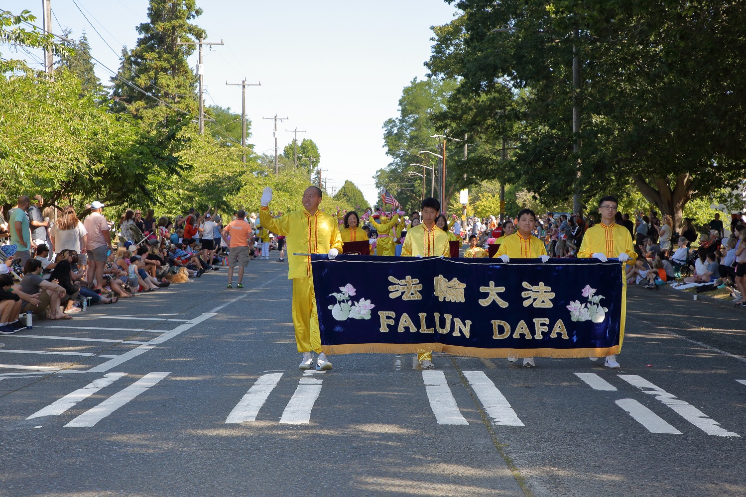 周六上午,游行开始。法轮功学员的游行队伍由手持中英文“法轮大法 Falun Dafa”横幅的学员打头阵,紧随其后的是“真”、“善”、“忍”横幅和手捧莲花的大法小弟子。由数十名学员组成的腰鼓队是游行队伍的核心。腰鼓队员们身着明黄色炼功服,为观众们表演了《法轮大法好》、《喜庆》等乐曲。每支乐曲结束,观众们都会热烈鼓掌喝彩。