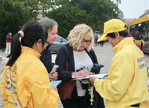 绘图师乔兰塔(Jolanta)看见了法轮功的游行。三天前的晚上,她曾在中共大使馆前看到法轮功学员举办的烛光悼念活动,她得到了一张传单,她说自己知道在中国发生了很多迫害民众的事情,但不知道更多的信息。