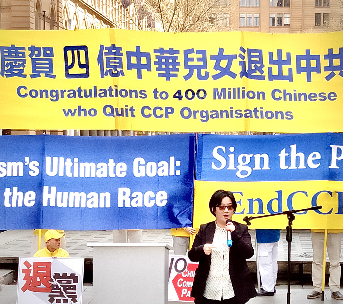 悉尼退党中心代表乔安娜(Joanna Zhou)在发言中说:“四亿中国人以难以置信的智慧和勇气退出了中共党、团、队组织(三退)。这是一个里程碑,为中国社会向和平时期过渡带来积极的改变。”