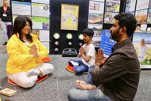她在博览会的第三天又来了,她说:“我特别想亲自尝试一下这功法。”于是,她跟着法轮功学员学炼了四套功法后,高兴地表示:“我庆幸今天又来了,我很喜欢这种平静祥和的感觉,非常舒服。”她向法轮功学员征询了当地炼功点地址,并表示她会去参加炼功点的周末集体炼功。