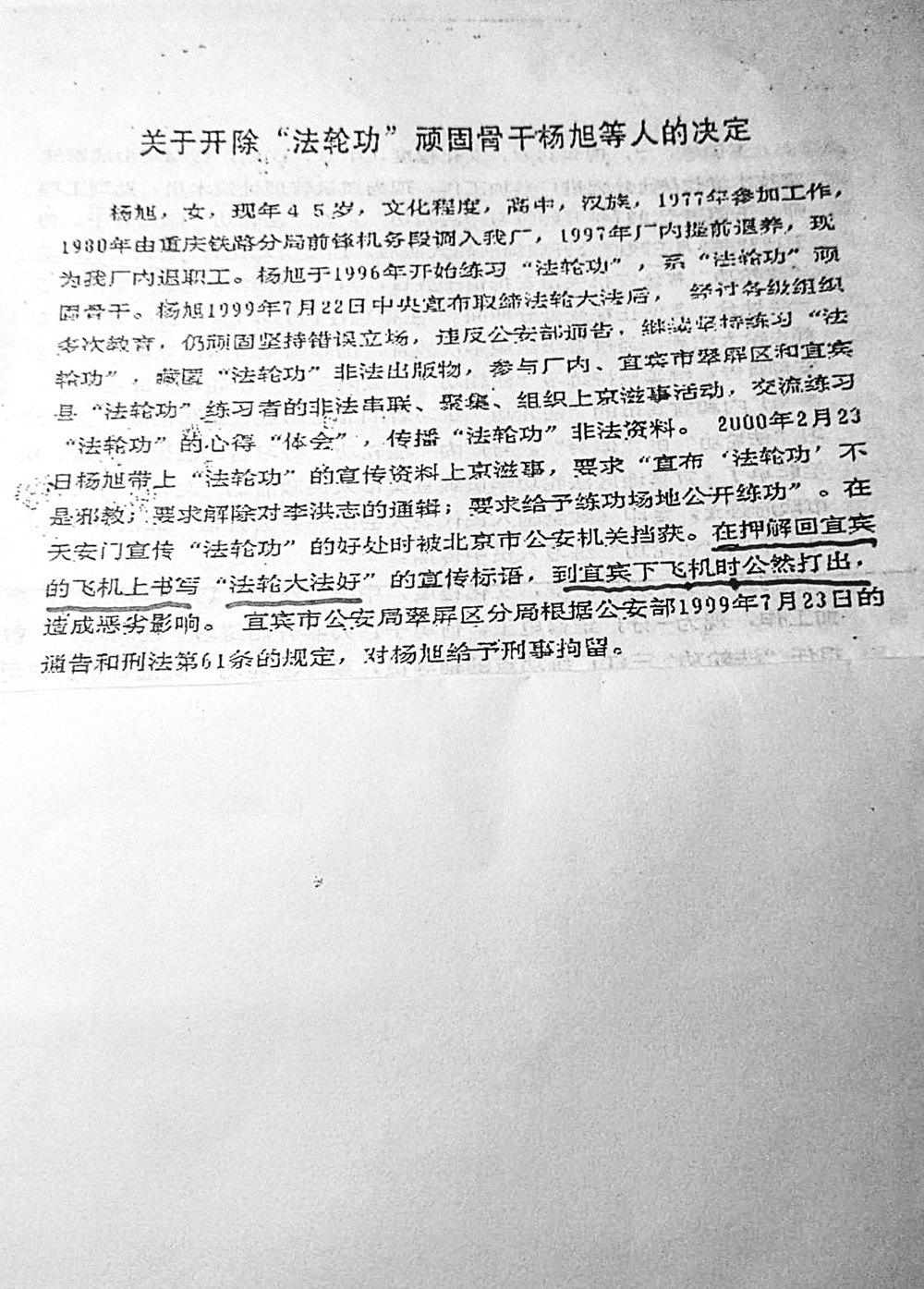 杨旭是四川宜宾市国营三江机械厂正式职工,是一名好妻子,一位好母亲。一九九六年,她修炼法轮大法后,体弱多病的身体神奇地恢复了健康,变得更加宽容祥和,不争名利、善良无私。因为不放弃修炼法轮功,坚持为法轮功鸣冤,她曾被多次非法判刑、劳教,先后被非法关押在不同的迫害大法弟子的黑窝,受尽残酷迫害达九年七个多月之久,并在二零零零年三月三十日被所在单位非法开除公职、停发退休金,三十多年(加知青)的工龄被全部清零,至今拿不到一分钱的退休金。二零二二年五月,三江厂不法人员伙同社区工作人员非法扣押她最低的生活来源(是家人省吃俭用给她买的最低的社保金),现在连这个自己出资购买的基本生活费也被当地社区非法扣押,没有上报到宜宾市社保局,致使她从今年五月份开始到现在拿不到一分钱生活费。