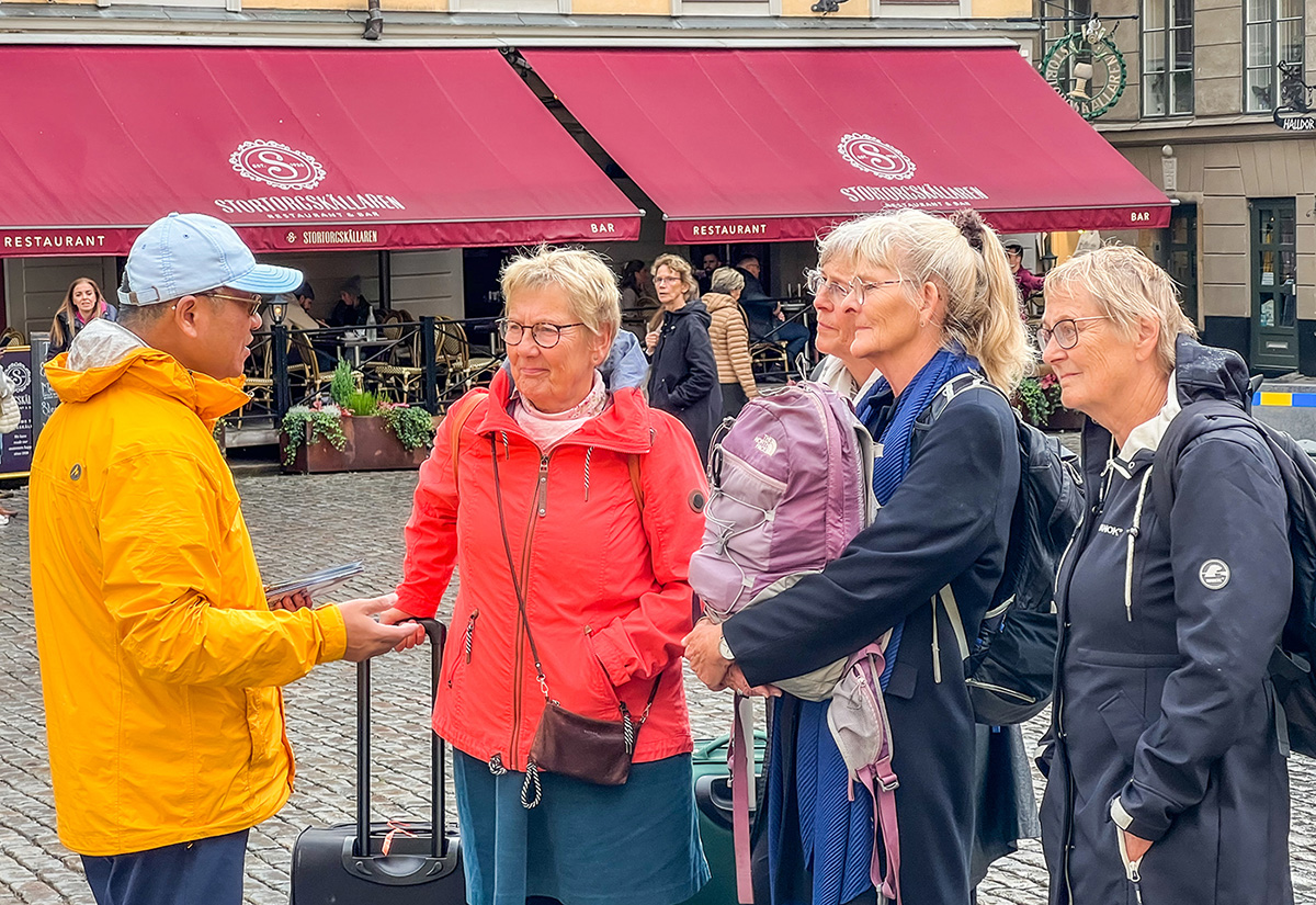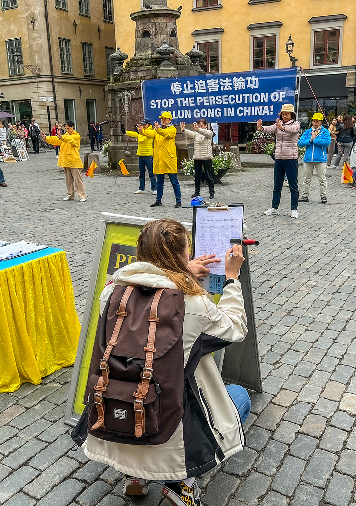 二零二二年九月份每个周五、周六两天的下午,法轮功学员们都在斯德哥尔摩诺贝尔博物馆前举办讲真相活动,向来自世界各地游客及当地民众展示大法的美好,揭露中共迫害法轮功及活摘法轮功学员器官的罪行。人们了解真相后,纷纷签名支持制止迫害,谴责中共暴行。其中包括一对瑞典夫妇安(Ann)和她的先生。