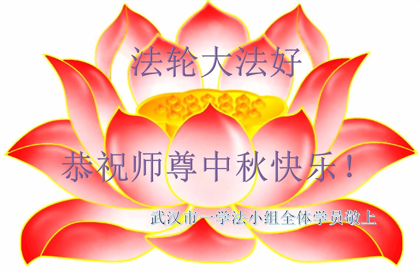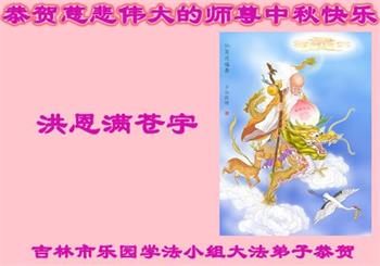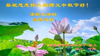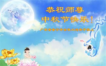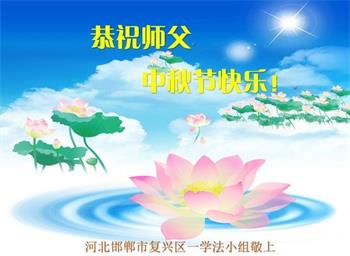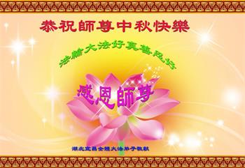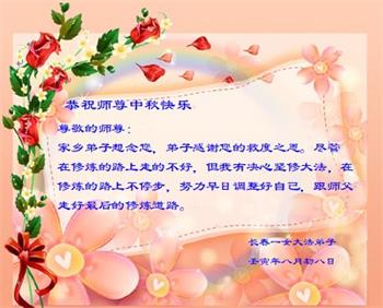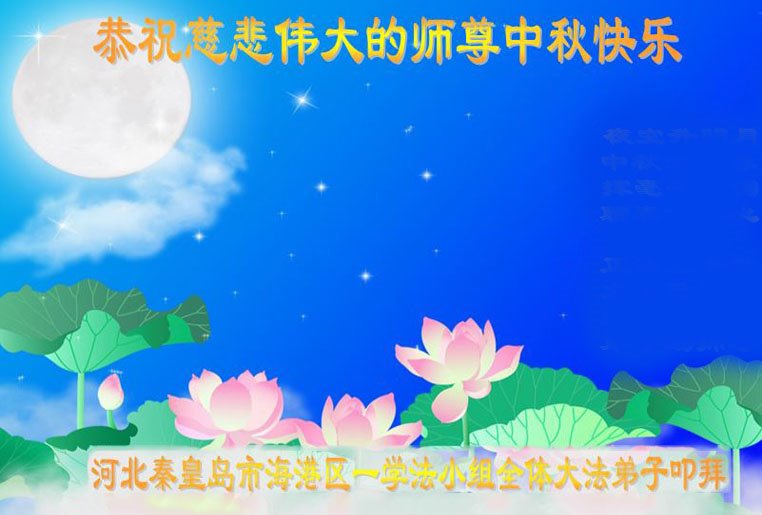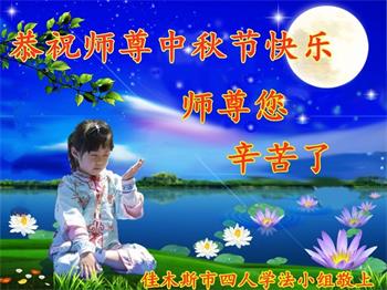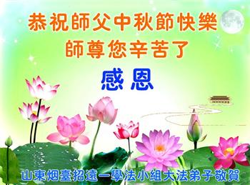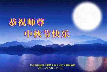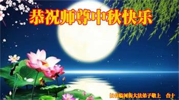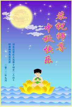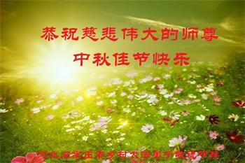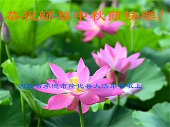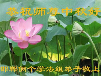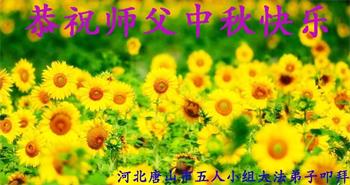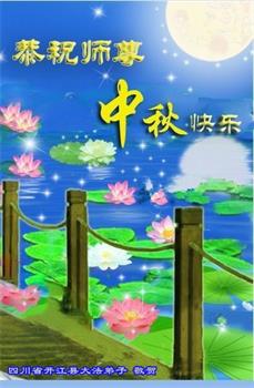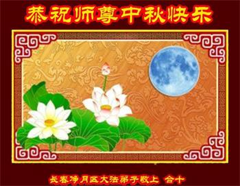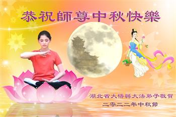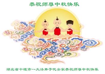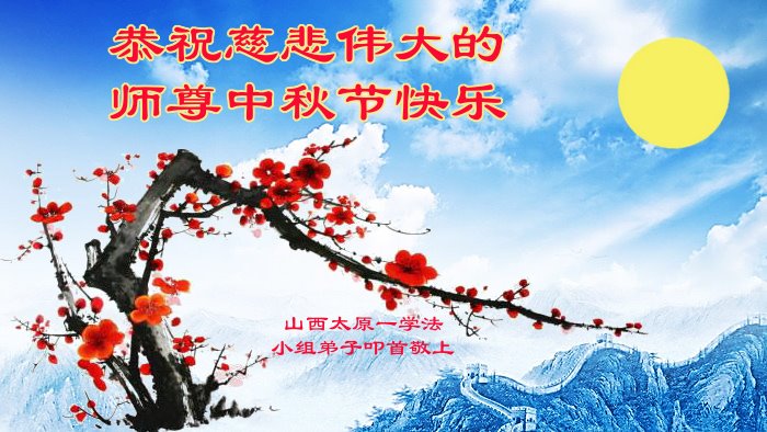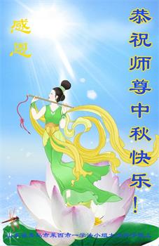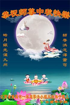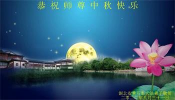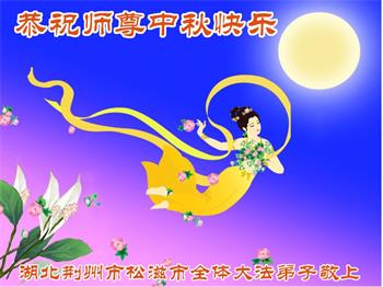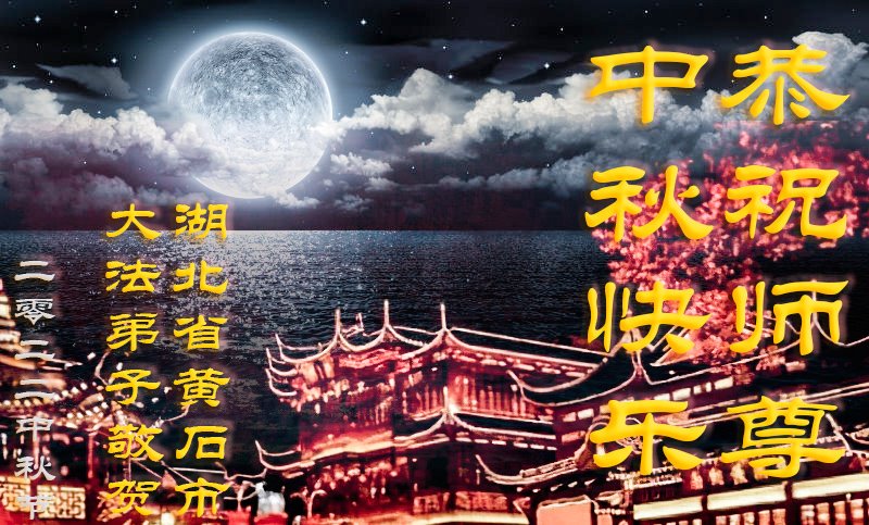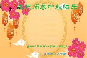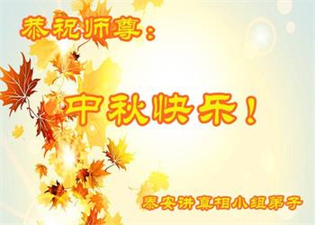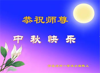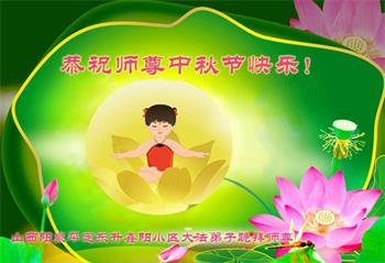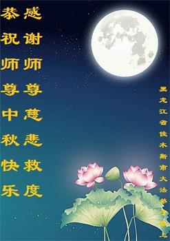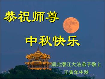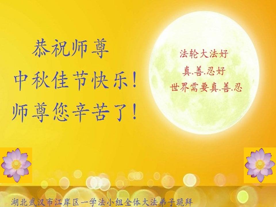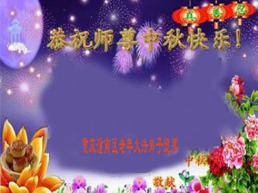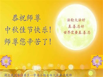 湖北省黄冈市一学法小组大法弟子在贺词中说:“月到中秋分外明,每逢佳节倍思亲。在这美好的时刻,我们十分想念师尊,伟大的师尊所承受的、付出的,弟子不知道用何语言来形容表达。在正法最后时刻,唯弟子勇猛精進,遵师言,做好三件事,快救人,多救人。”