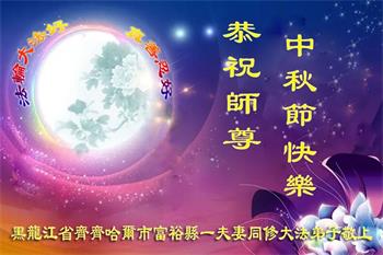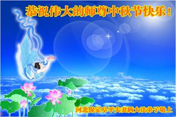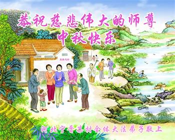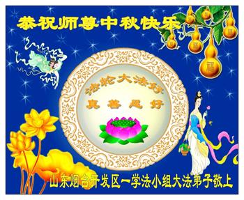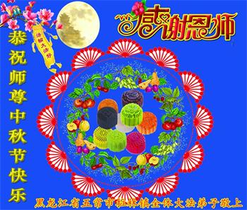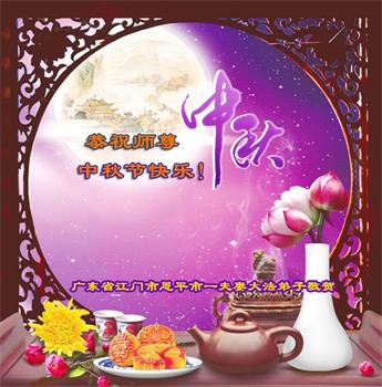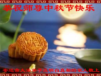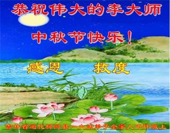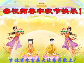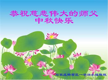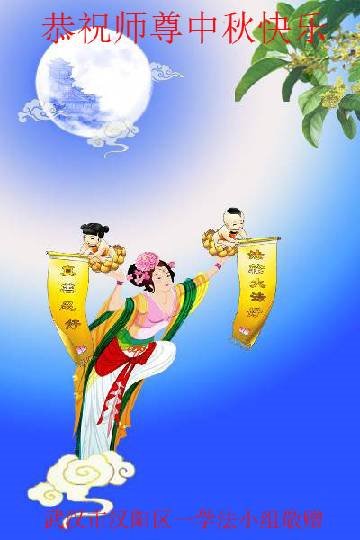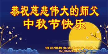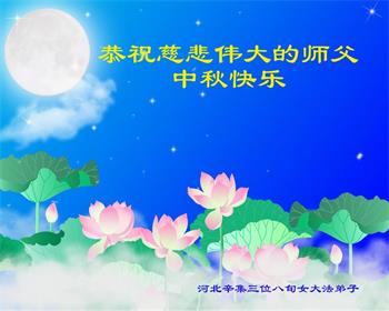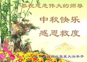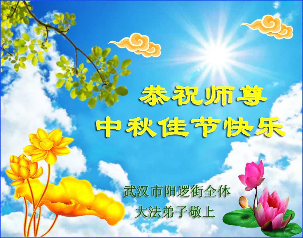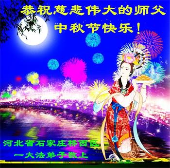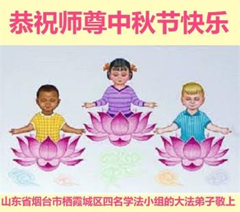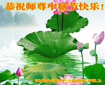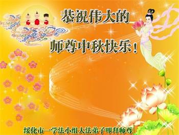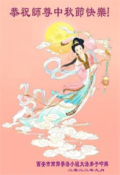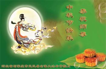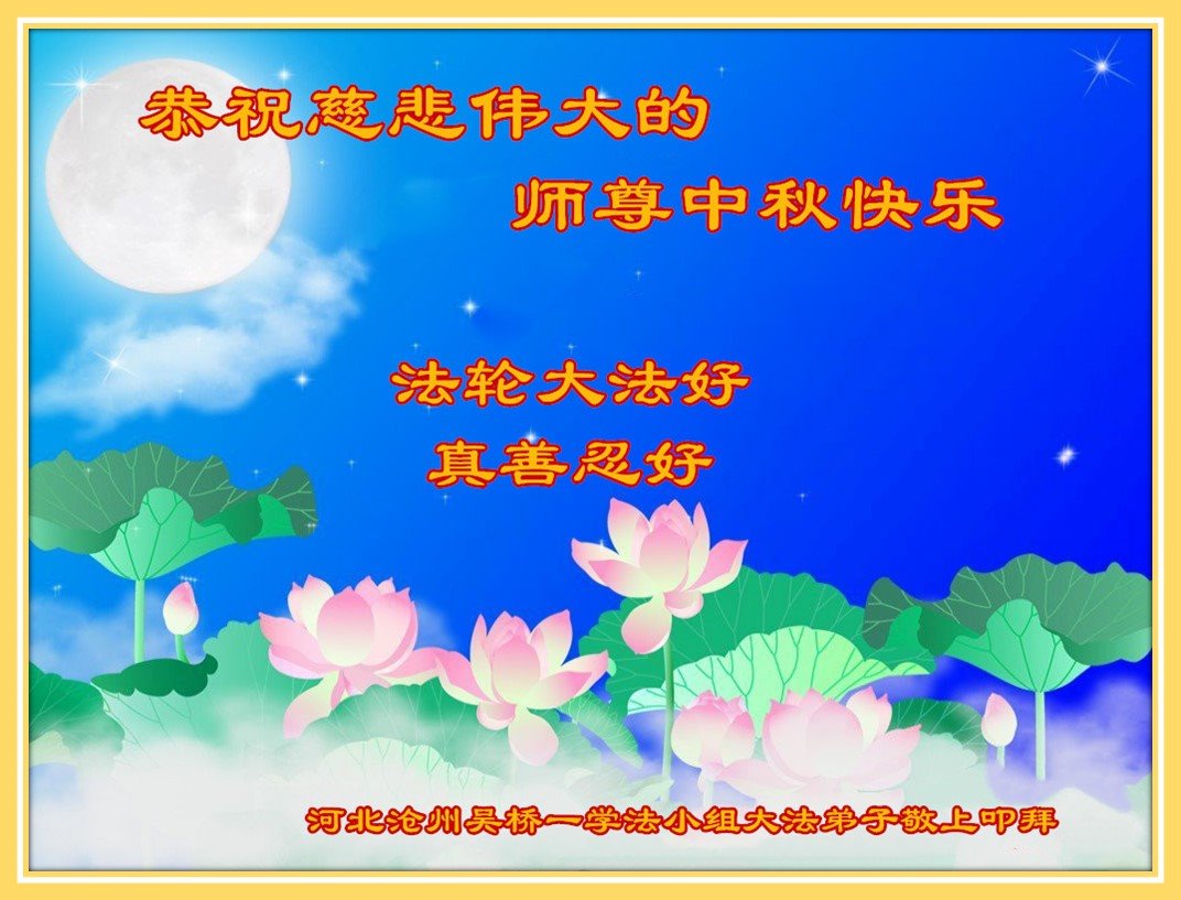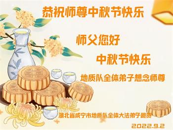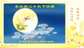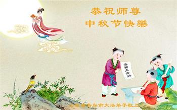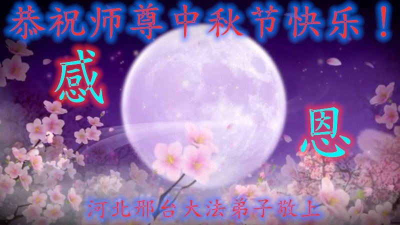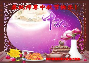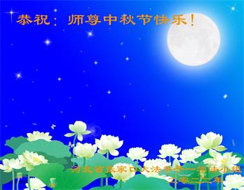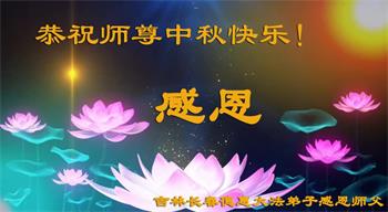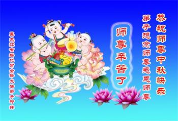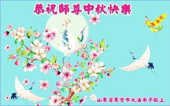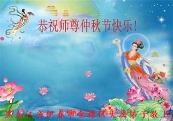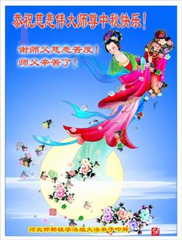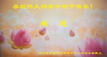 湖北省黄冈市一学法小组大法弟子在贺词中说:“月到中秋分外明,每逢佳节倍思亲。在这美好的时刻,我们十分想念师尊,伟大的师尊所承受的、付出的,弟子不知道用何语言来形容表达。在正法最后时刻,唯弟子勇猛精進,遵师言,做好三件事,快救人,多救人。”