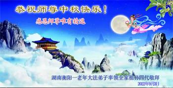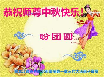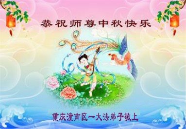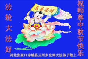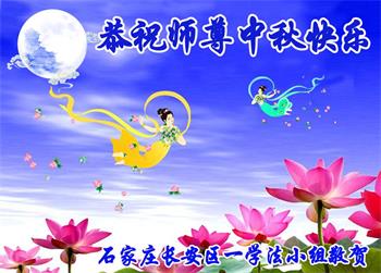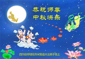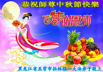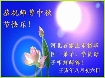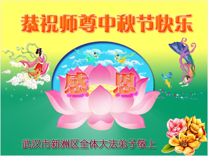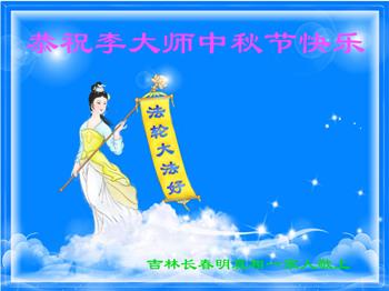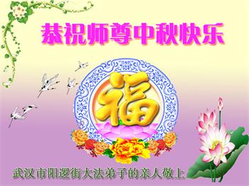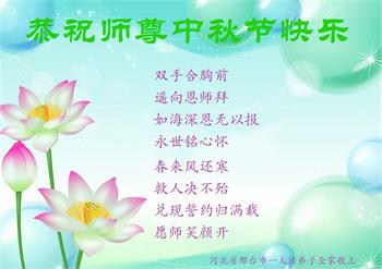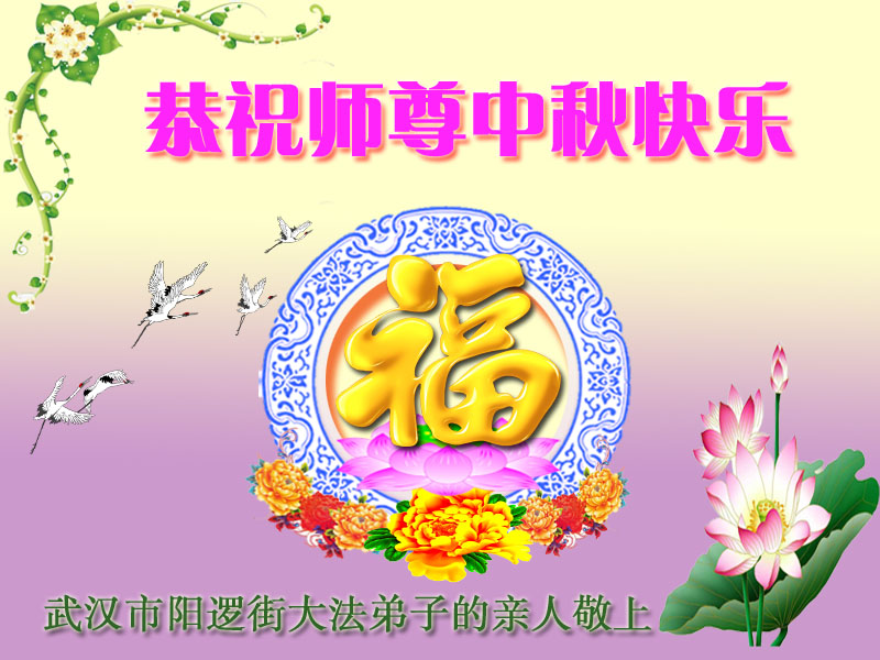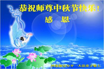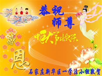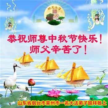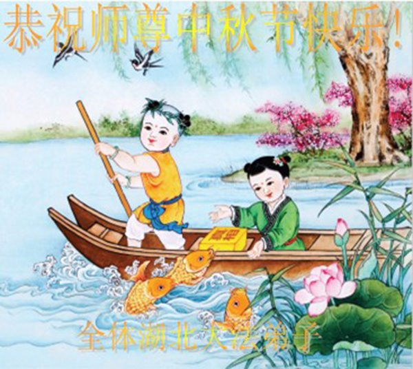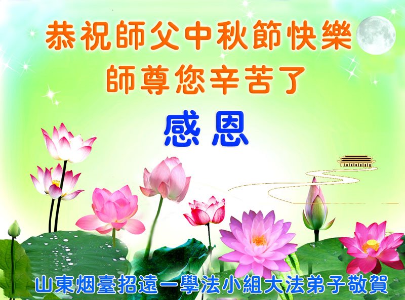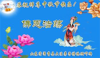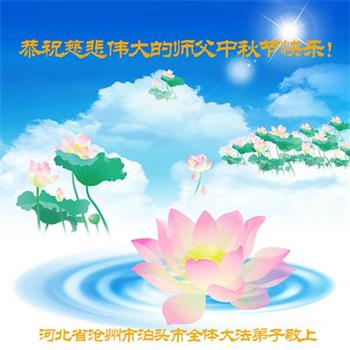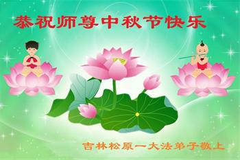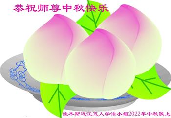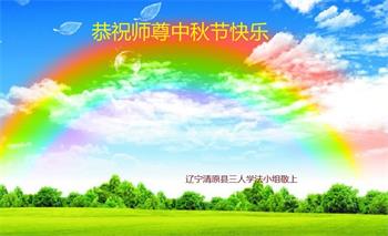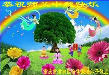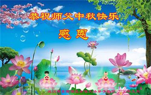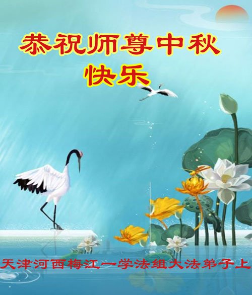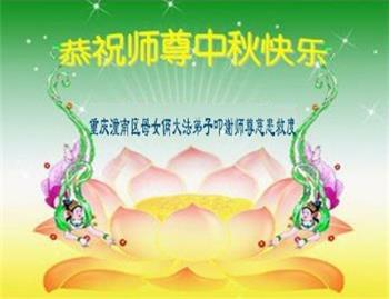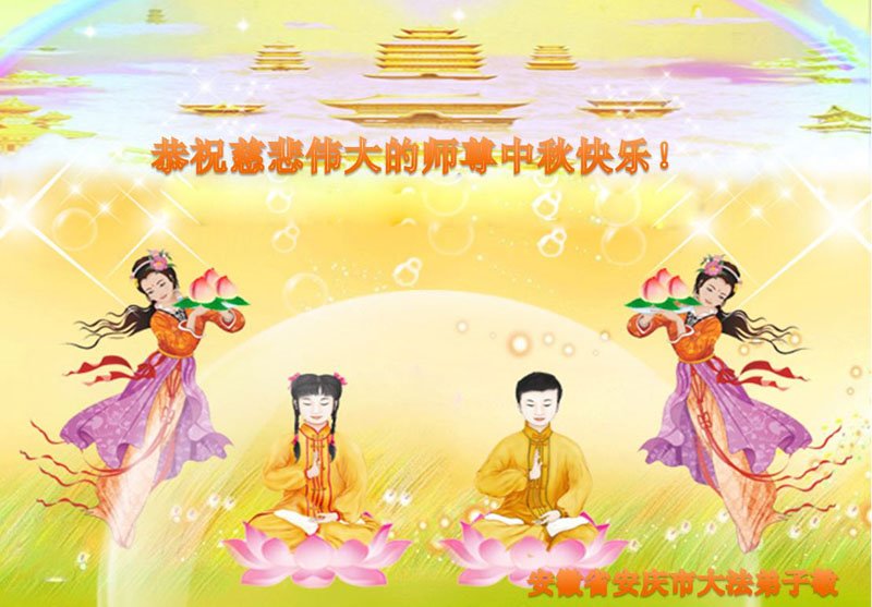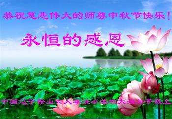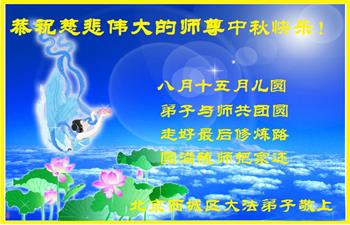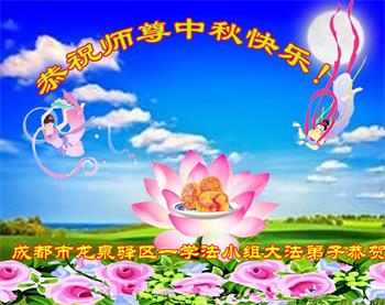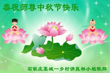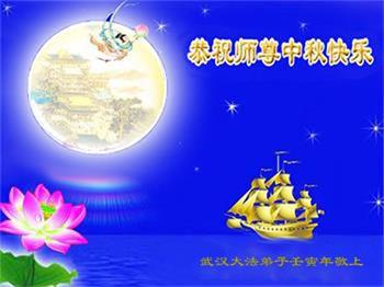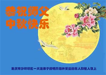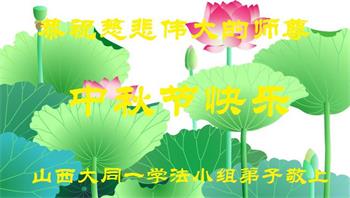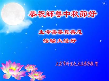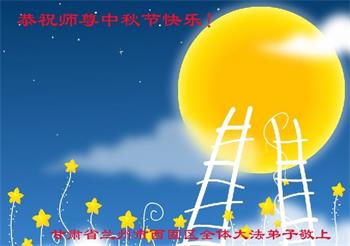 湖北省黄冈市一学法小组大法弟子在贺词中说:“月到中秋分外明,每逢佳节倍思亲。在这美好的时刻,我们十分想念师尊,伟大的师尊所承受的、付出的,弟子不知道用何语言来形容表达。在正法最后时刻,唯弟子勇猛精進,遵师言,做好三件事,快救人,多救人。”
