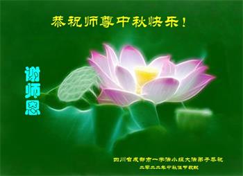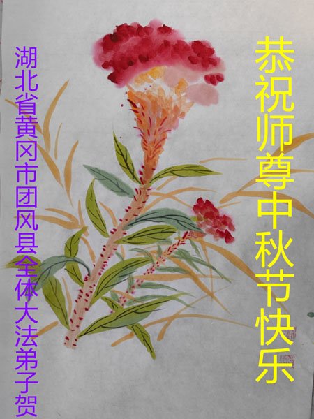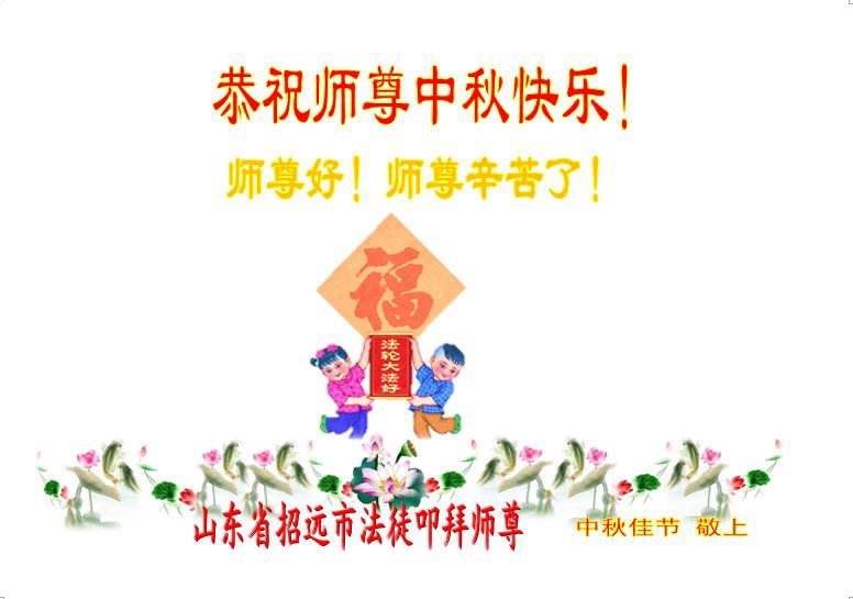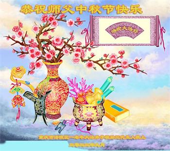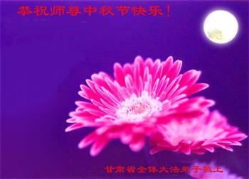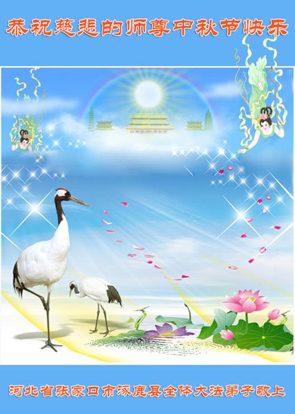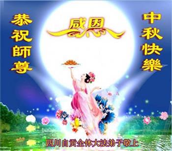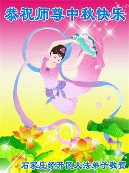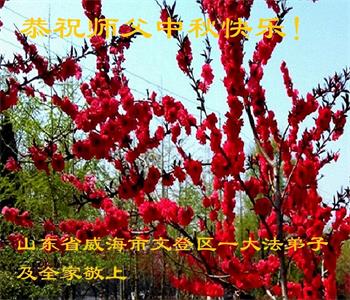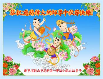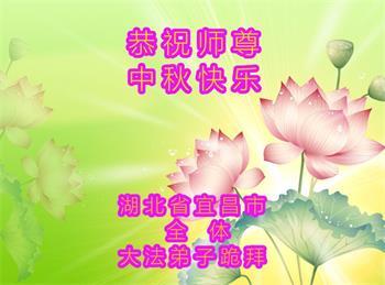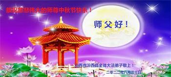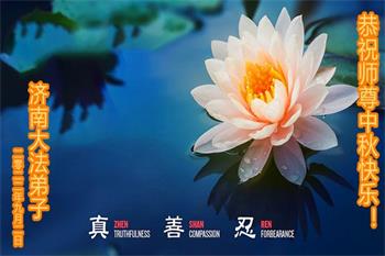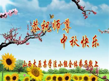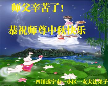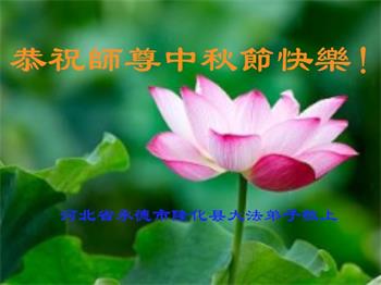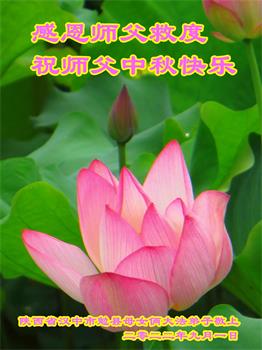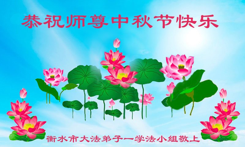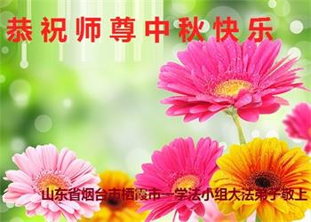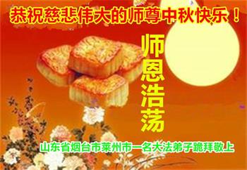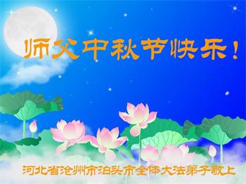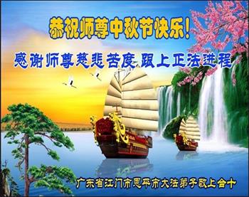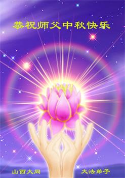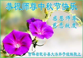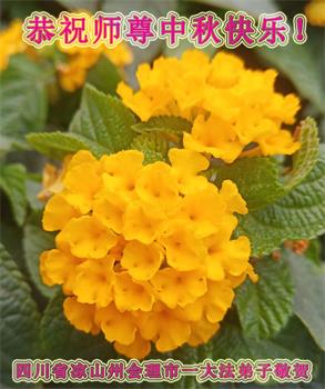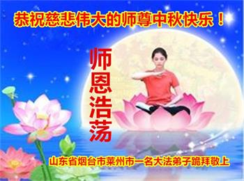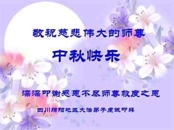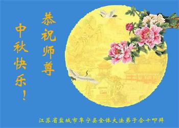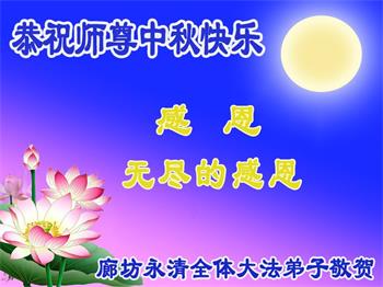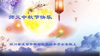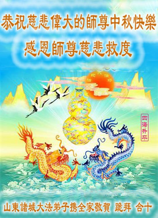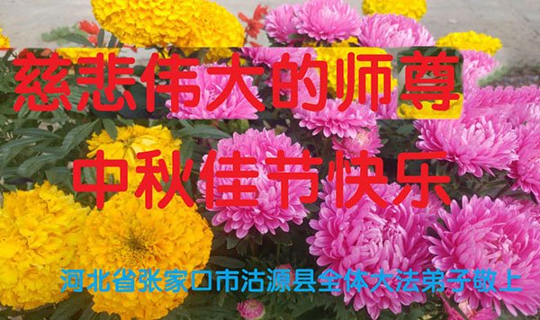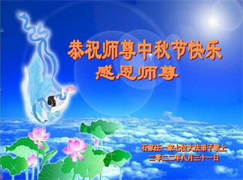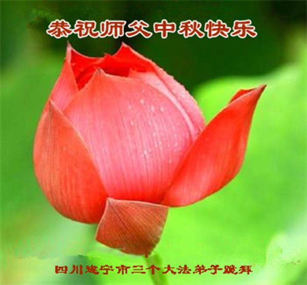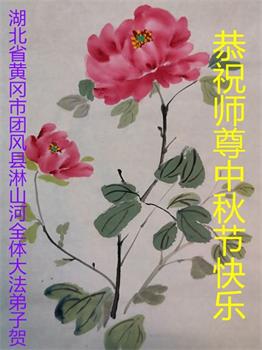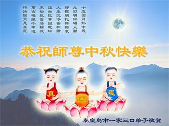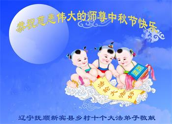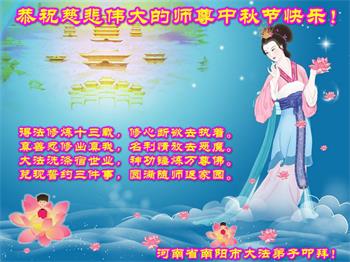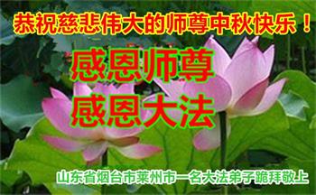湖北省黄冈市一学法小组大法弟子在贺词中说:“月到中秋分外明,每逢佳节倍思亲。在这美好的时刻,我们十分想念师尊,伟大的师尊所承受的、付出的,弟子不知道用何语言来形容表达。在正法最后时刻,唯弟子勇猛精進,遵师言,做好三件事,快救人,多救人。”