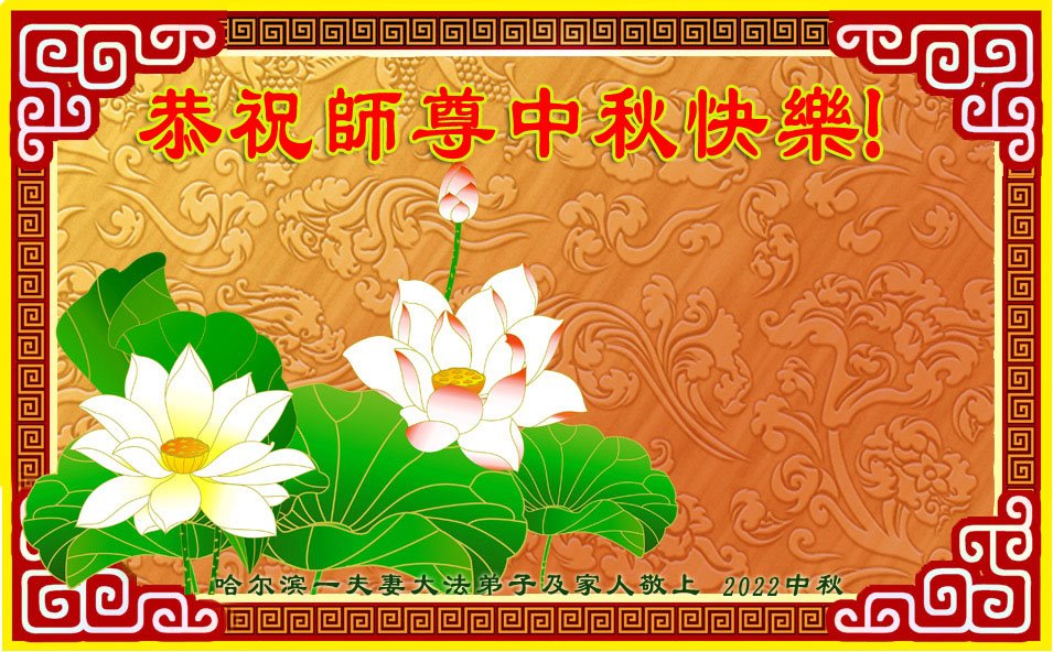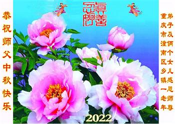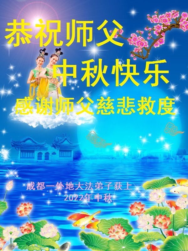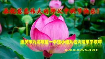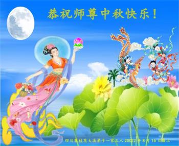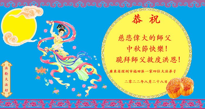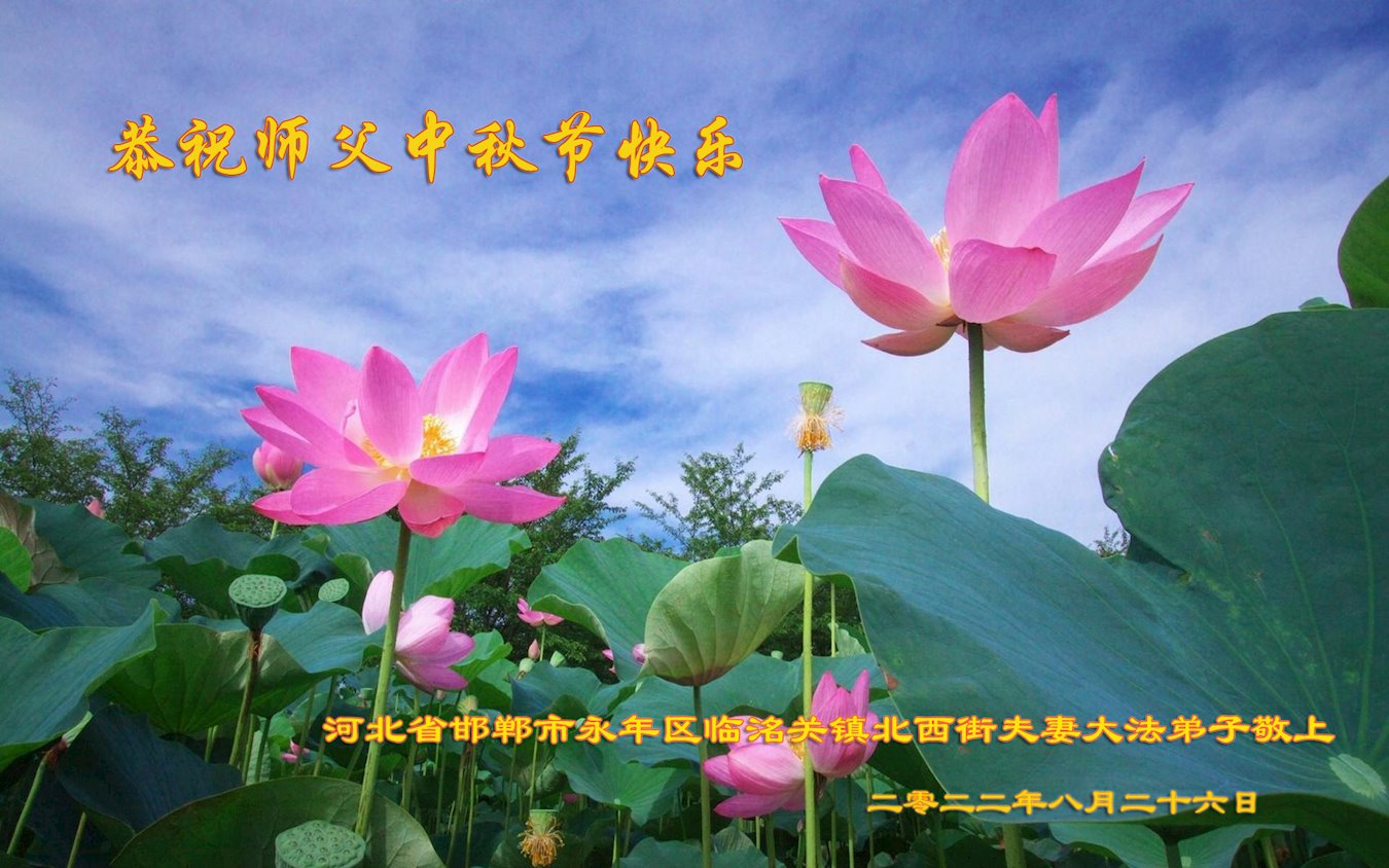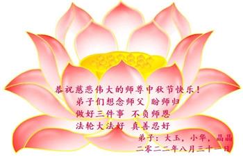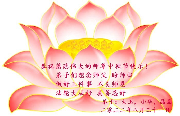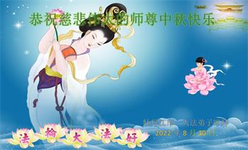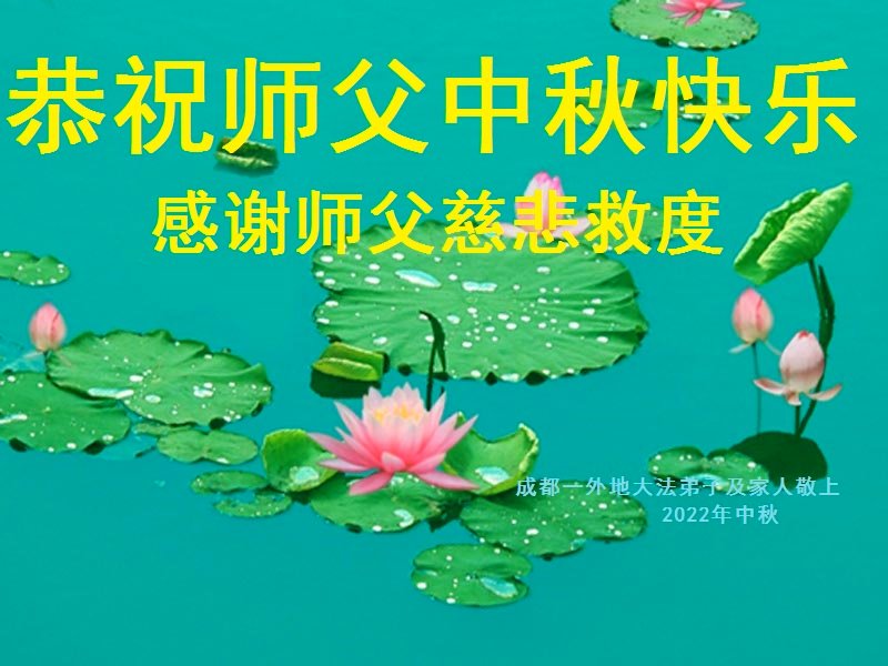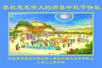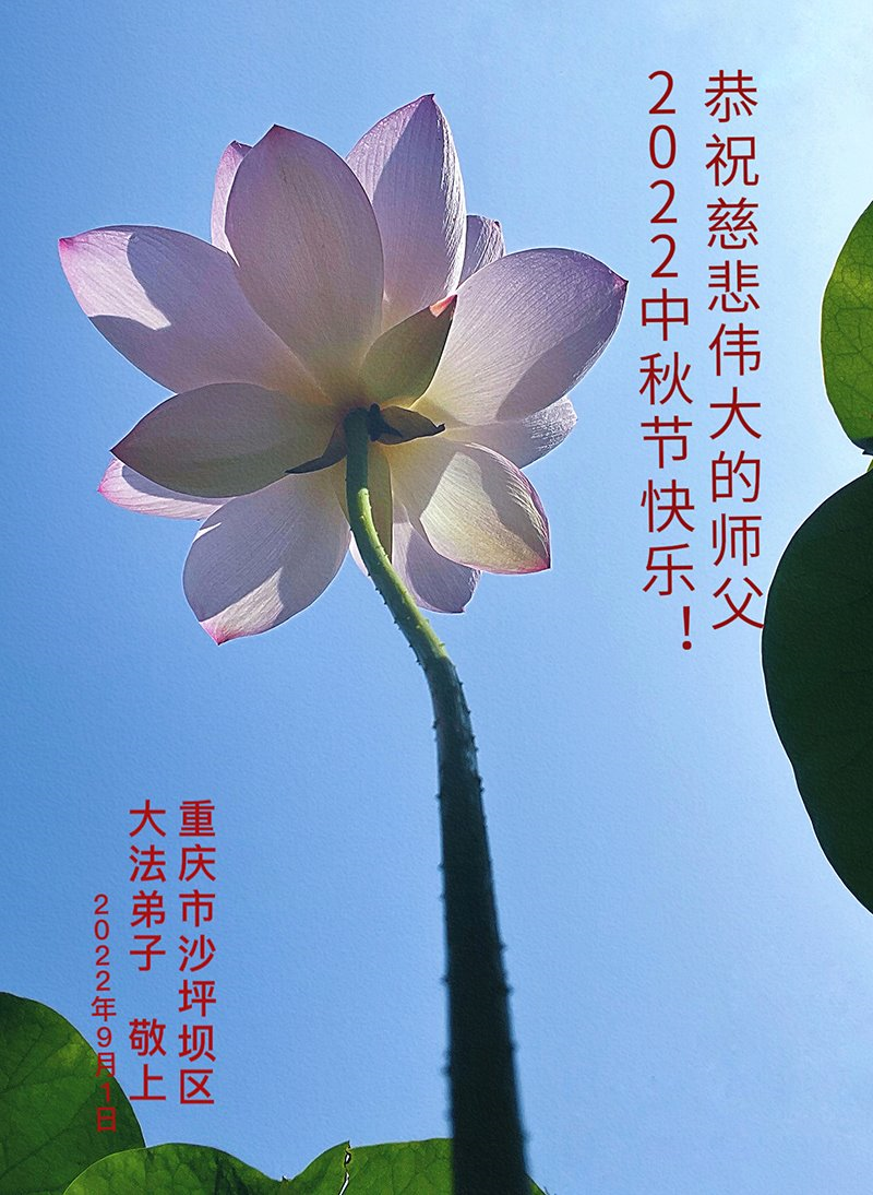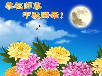 【明慧网二零二二年九月八日】法轮大法洪传世间,李洪志师尊慈悲的教诲和度化弟子,也慈悲的看护着世上每一个有缘人,把法轮大法的甘露洒向世界的每个角落,诚信“法轮大法好、真善忍好”的人们得到了大法给予的福祉。在二零二二年中秋节即将到来之际,明白法轮大法好的中国百姓向尊敬的李大师表达发自心底的感恩,恭祝大法师父中秋节快乐!