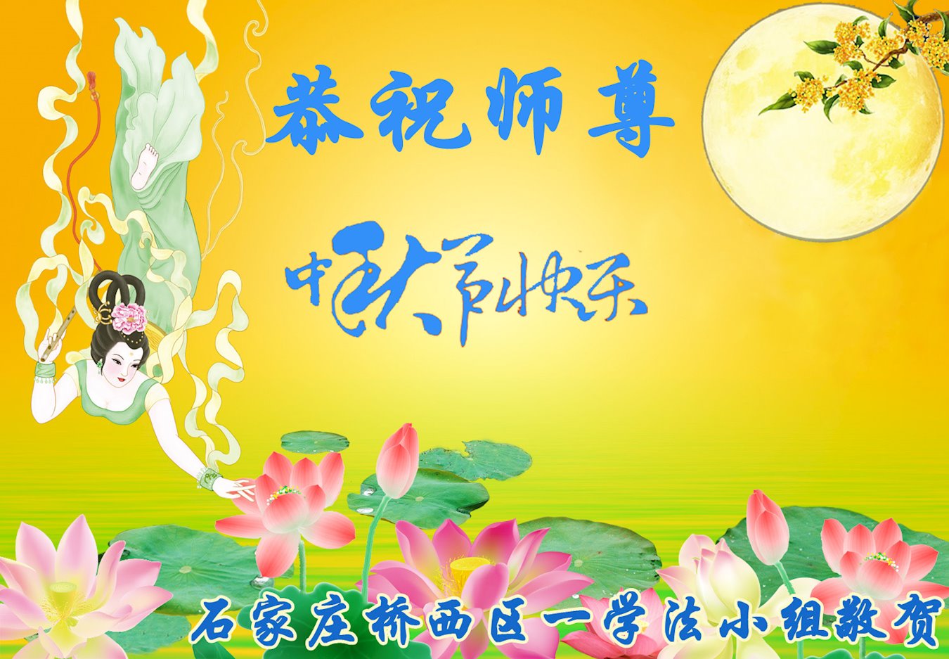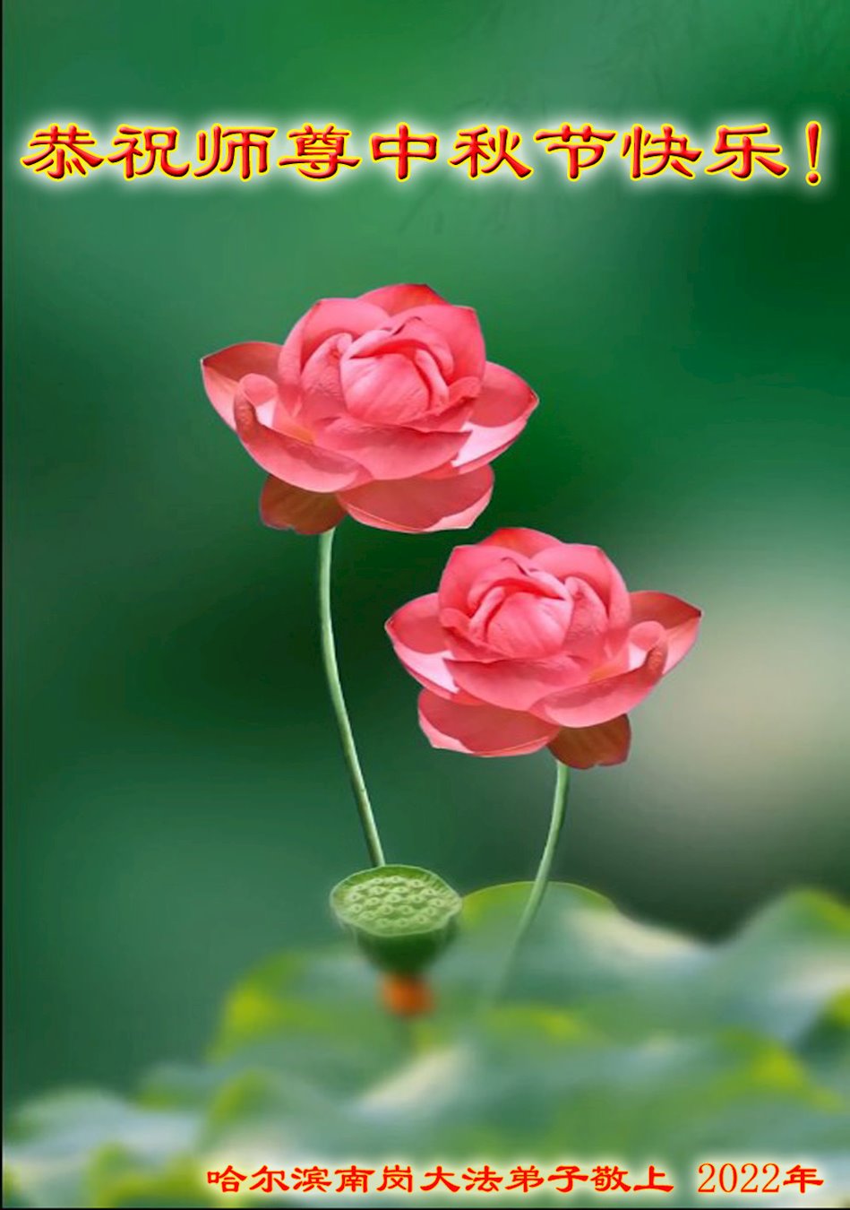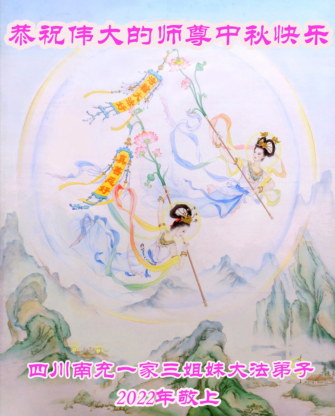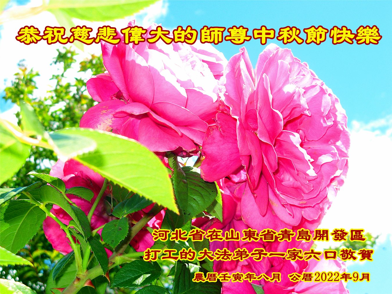 【明慧网二零二二年九月八日】法轮大法洪传世间,李洪志师尊慈悲的教诲和度化弟子,也慈悲的看护着世上每一个有缘人,把法轮大法的甘露洒向世界的每个角落,诚信“法轮大法好、真善忍好”的人们得到了大法给予的福祉。在二零二二年中秋节即将到来之际,明白法轮大法好的中国百姓向尊敬的李大师表达发自心底的感恩,恭祝大法师父中秋节快乐!