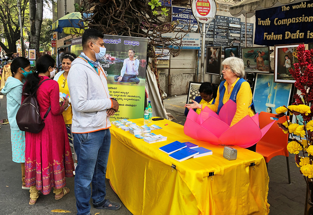 一月八日,印度卡纳塔克邦首府班加罗尔举办“全民艺术”博览会。法轮功学员在博览会上设立了展位。