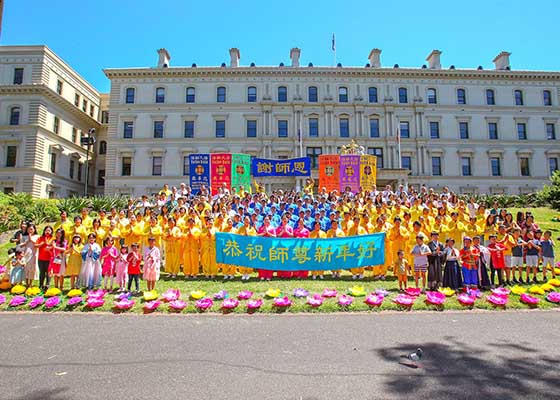 中国新年前夕,澳大利亚墨尔本各族裔部分法轮功学员汇聚在市中心财政花园,以最诚挚的感恩之心,恭祝慈悲伟大的师尊李洪志先生新年快乐。