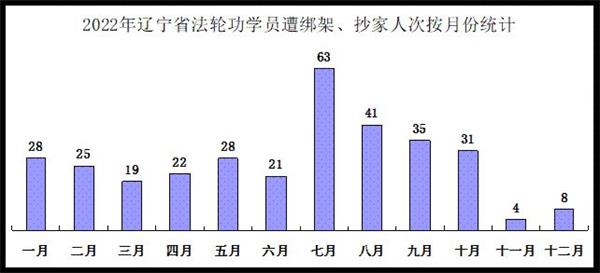 ![]() 图3:2022年辽宁省法轮功学员遭绑架、抄家人次按月份统计 |