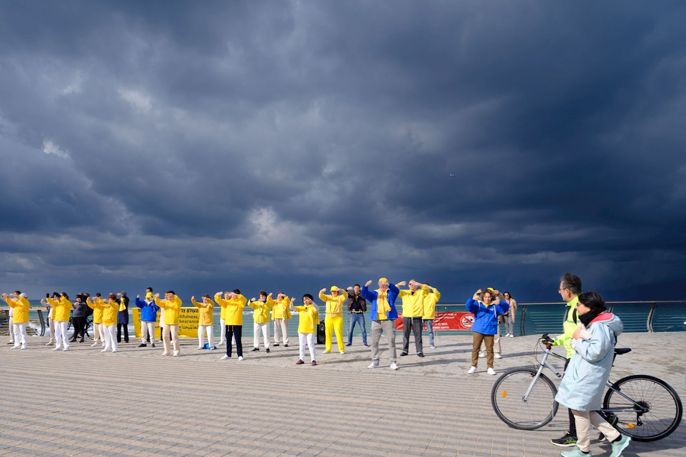 当天乌云密布、风大浪急,身着黄色衬衫的法轮功学员们(在海边)炼五套功法,带来了和谐的能量。许多路人驻足观看,领取资料,并对修炼产生了兴趣。法轮大法在全世界免费传授,所有资料都可以在互联网上获取。