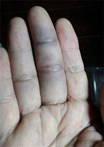 第二天,王晓玲的中指肿胀、发紫,拿东西使不起劲。