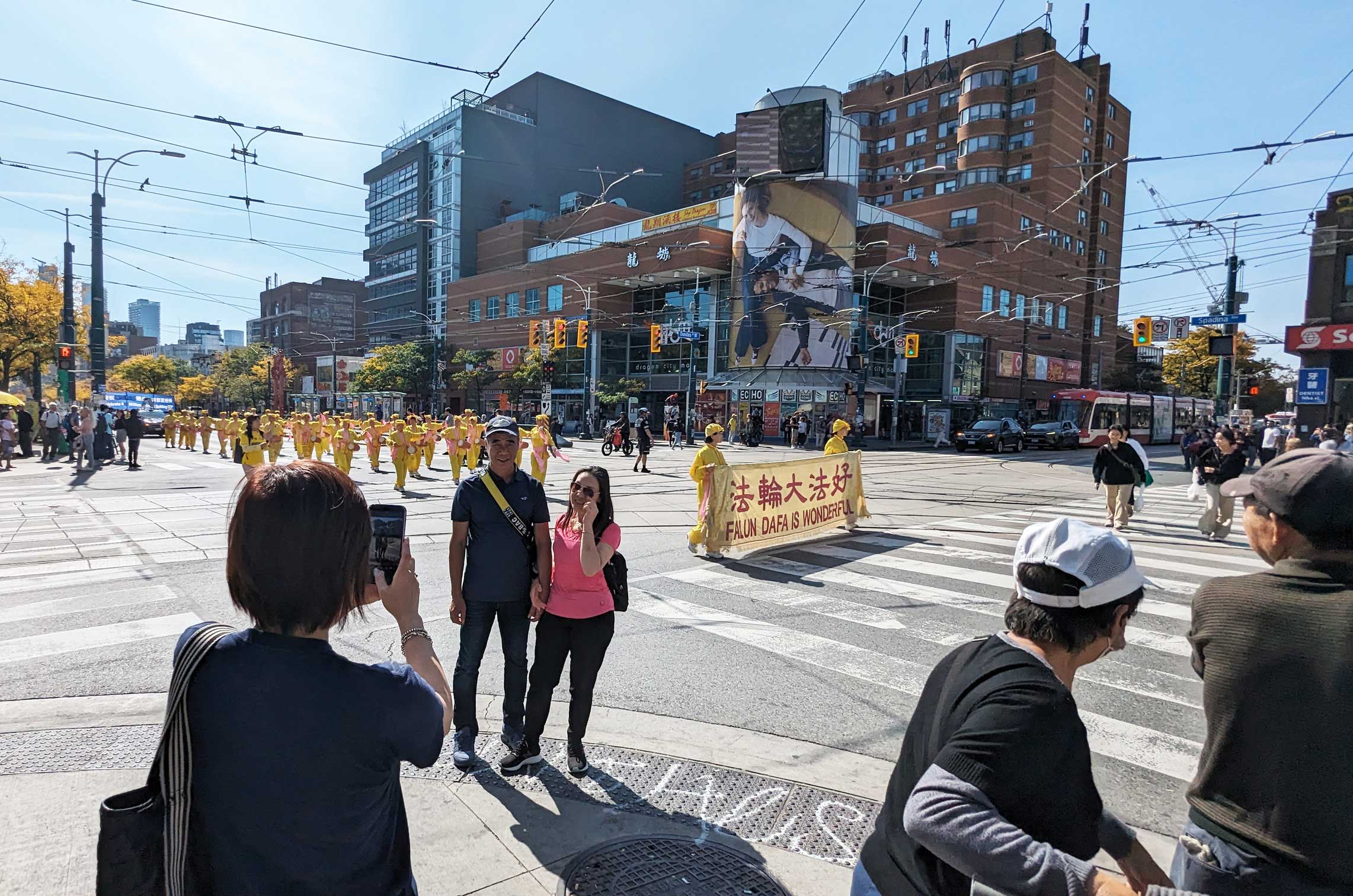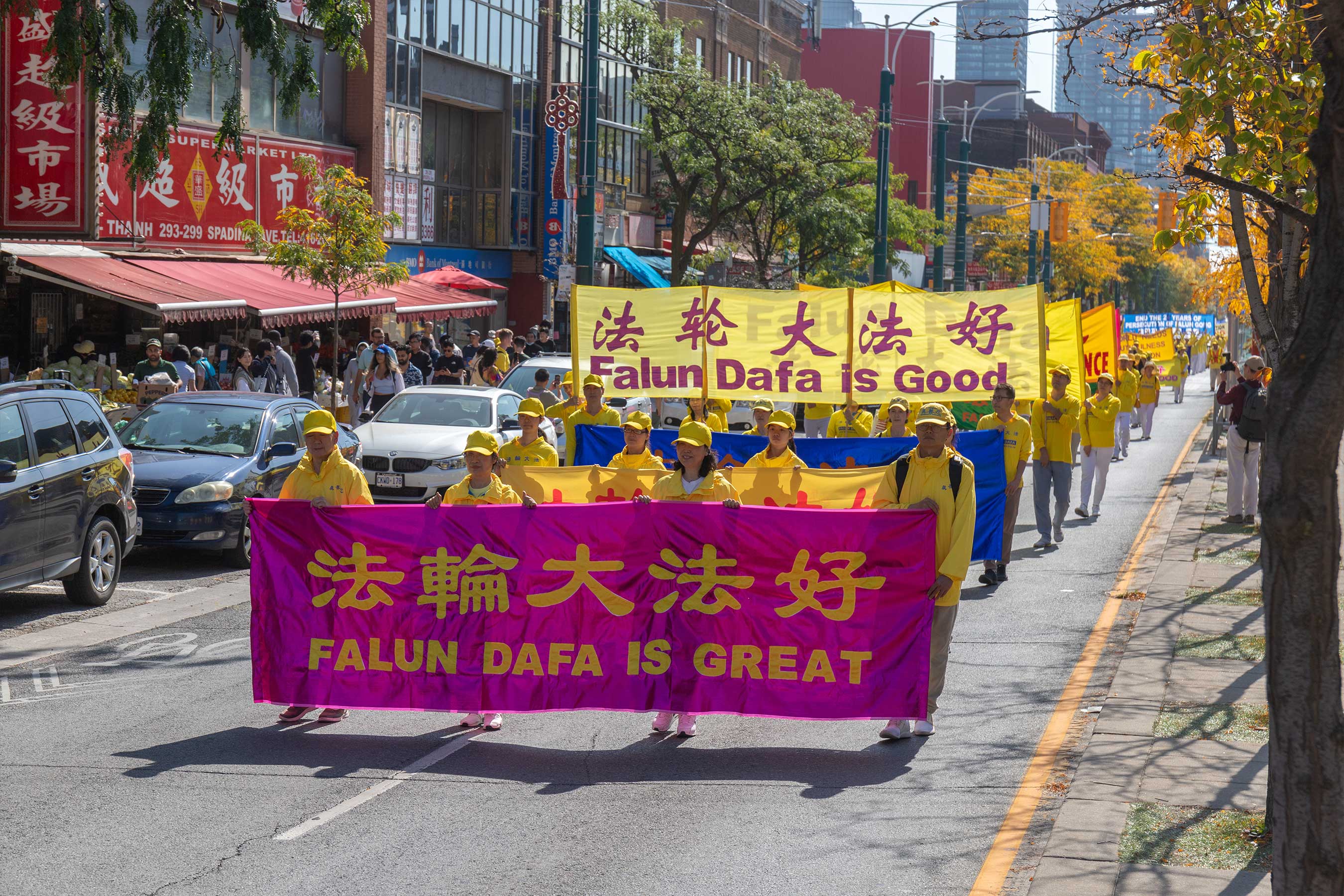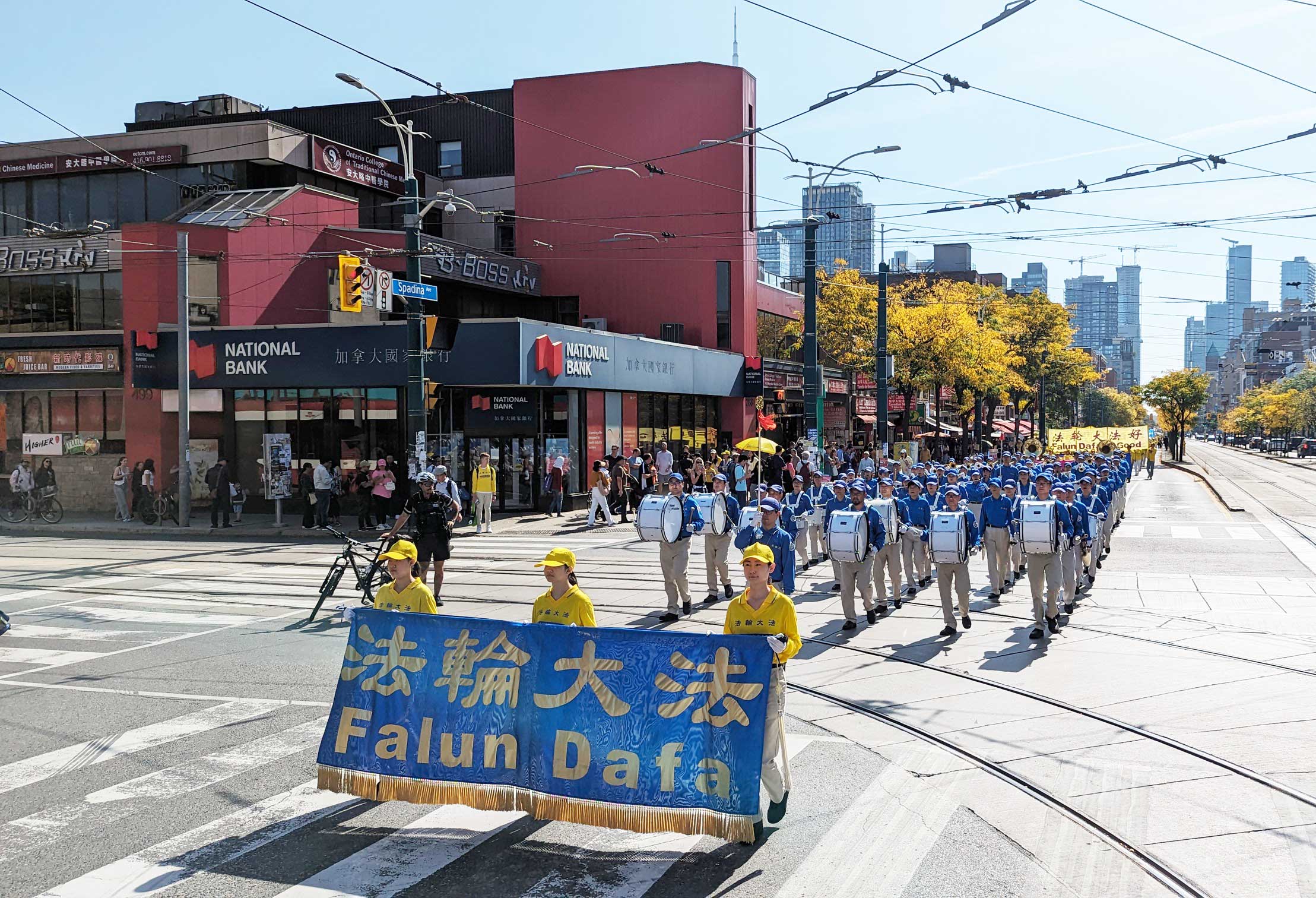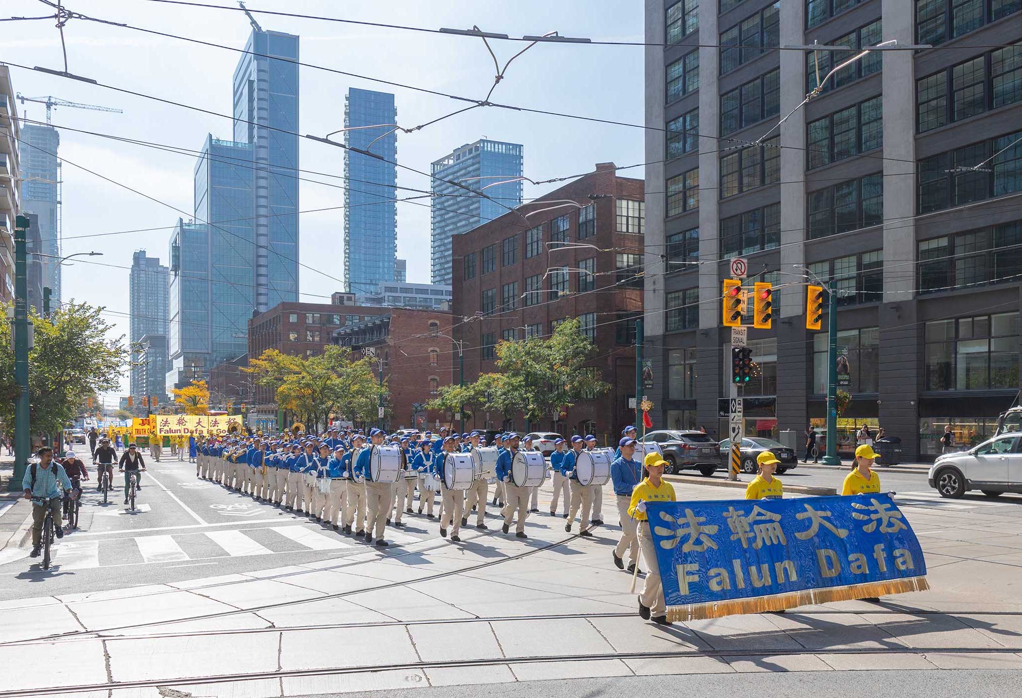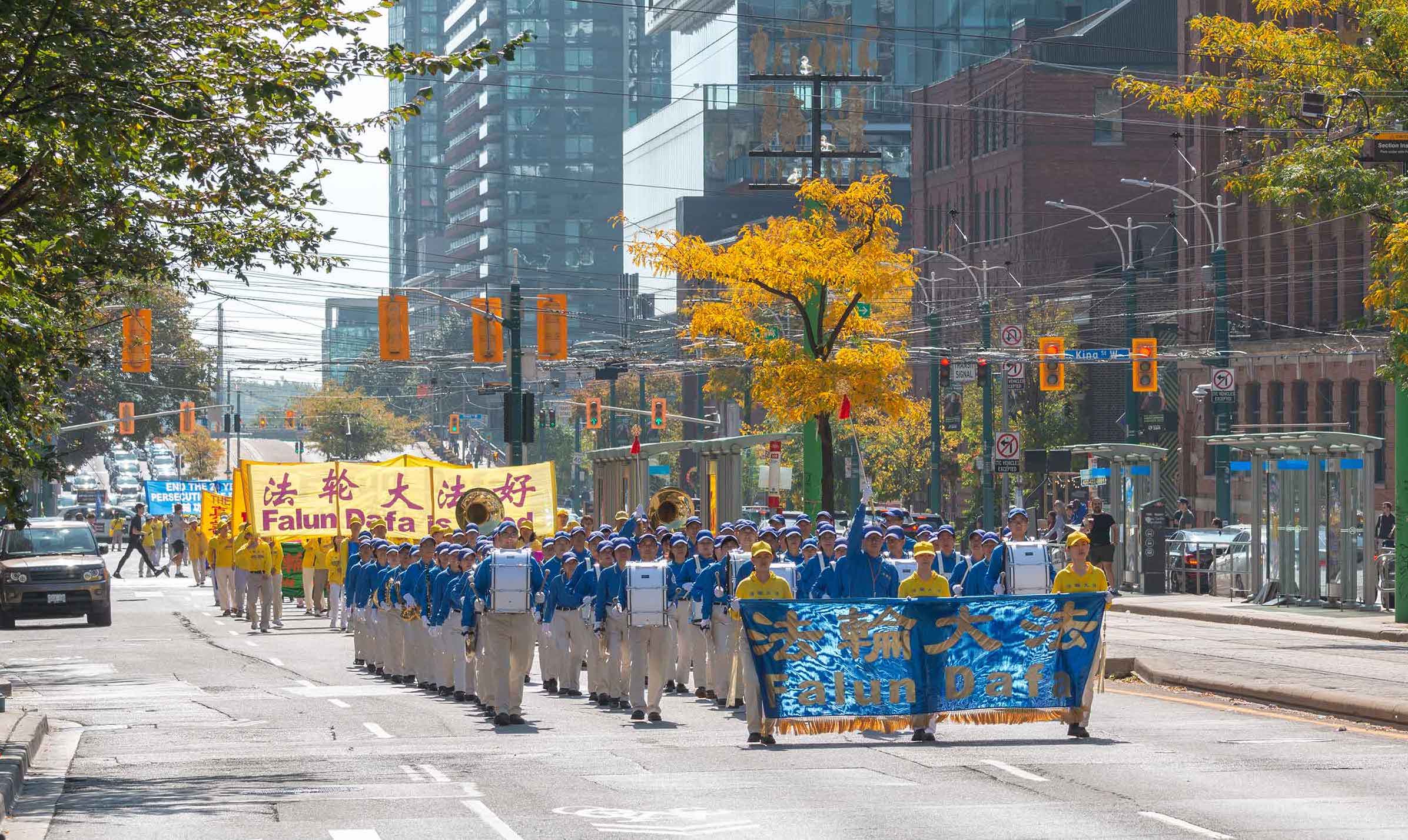 时到金秋,街上的树叶开始变黄。法轮功学员的反迫害游行,穿过商铺林立的街道,以及著名的地标多伦多大学、皇家安大略博物馆。人来人往的街道上,不少华人和西方人观看了游行,很多人谴责中共对法轮功持续至今已有二十四年的迫害。他们敬佩学员在强权的威逼、人性的考验下,仍选择坚守良知,保持善良。同时,人们盼望学员能早日守得拨云见日,迎来沉冤昭雪的那一天。