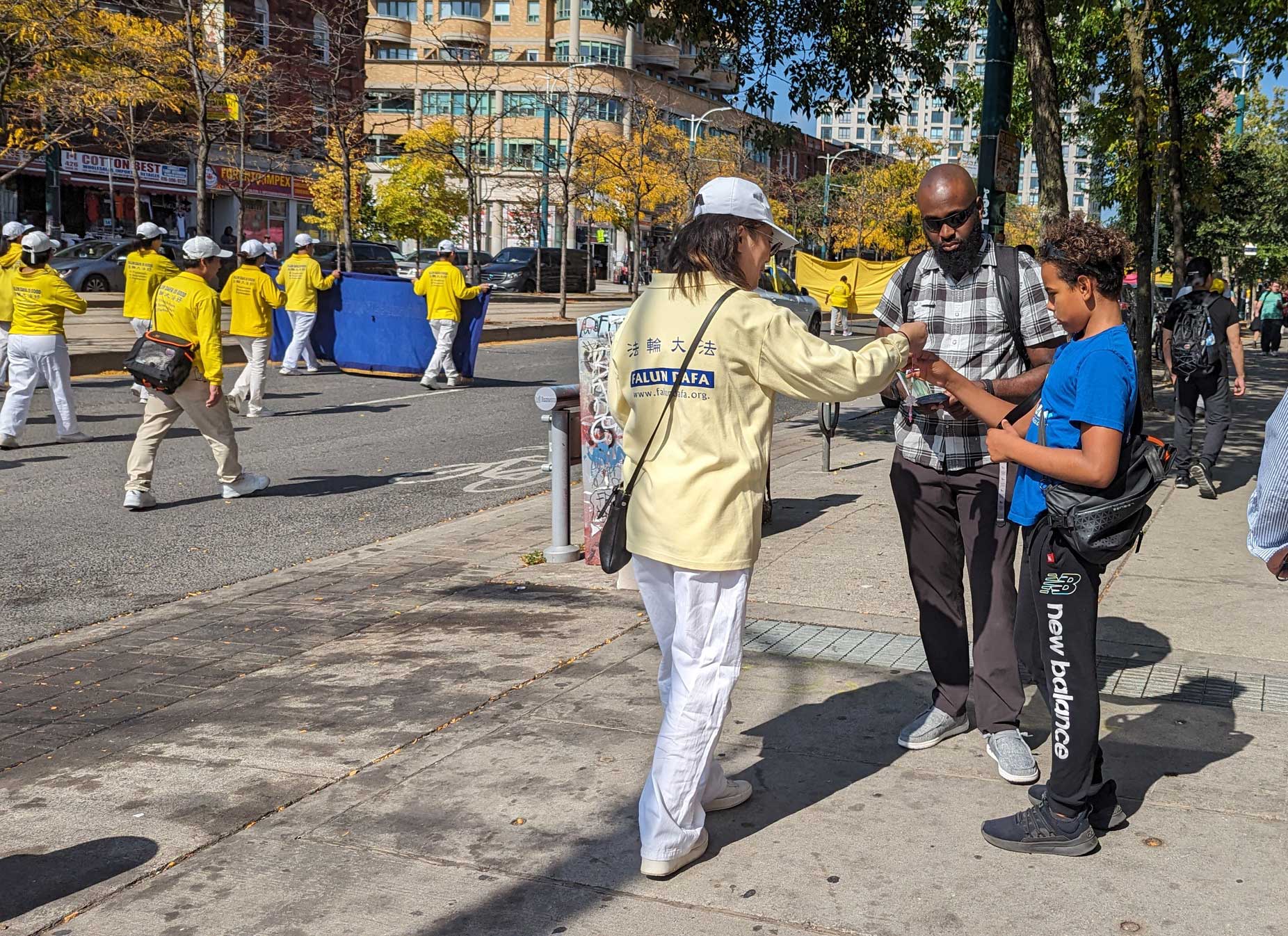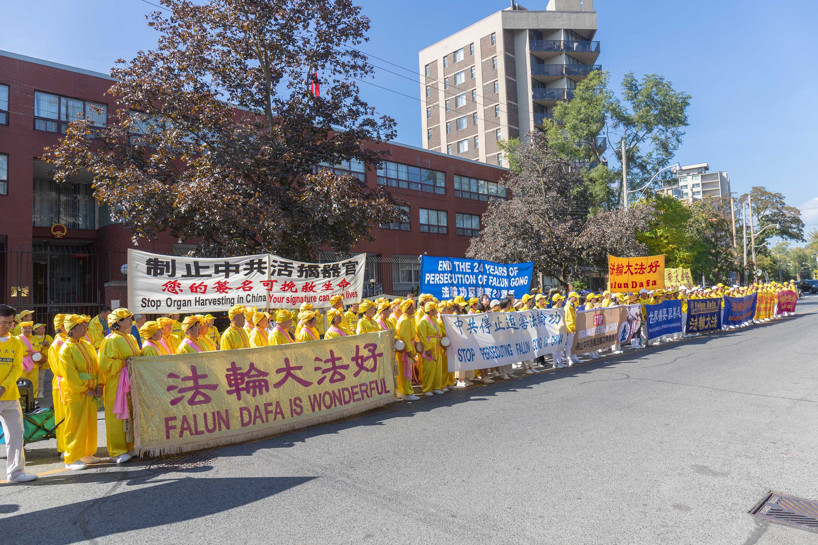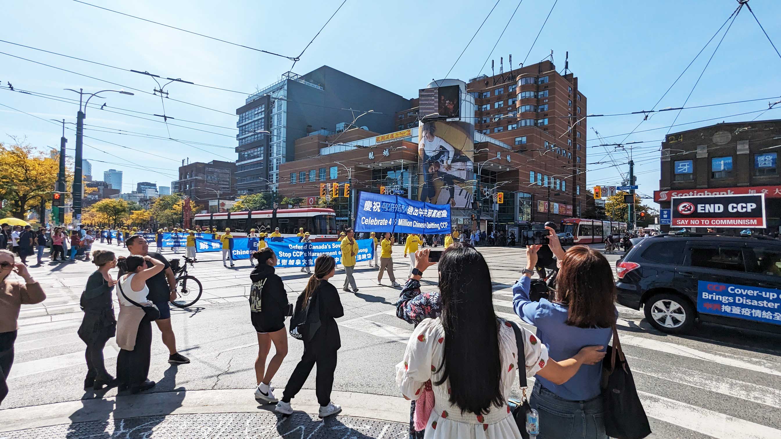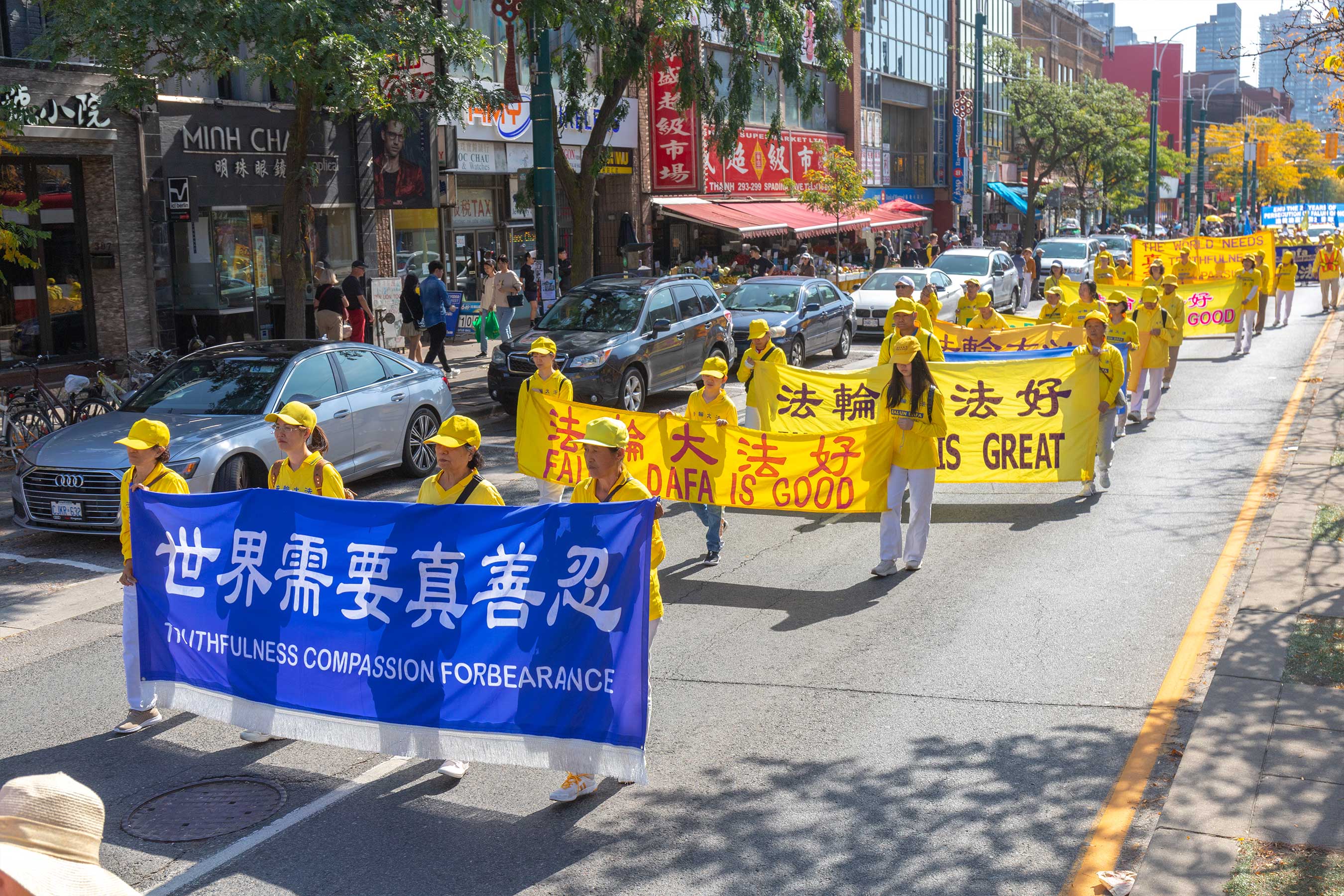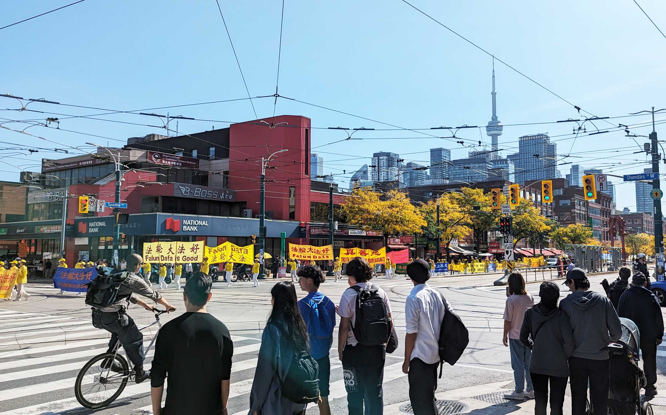 时到金秋,街上的树叶开始变黄。法轮功学员的反迫害游行,穿过商铺林立的街道,以及著名的地标多伦多大学、皇家安大略博物馆。人来人往的街道上,不少华人和西方人观看了游行,很多人谴责中共对法轮功持续至今已有二十四年的迫害。他们敬佩学员在强权的威逼、人性的考验下,仍选择坚守良知,保持善良。同时,人们盼望学员能早日守得拨云见日,迎来沉冤昭雪的那一天。