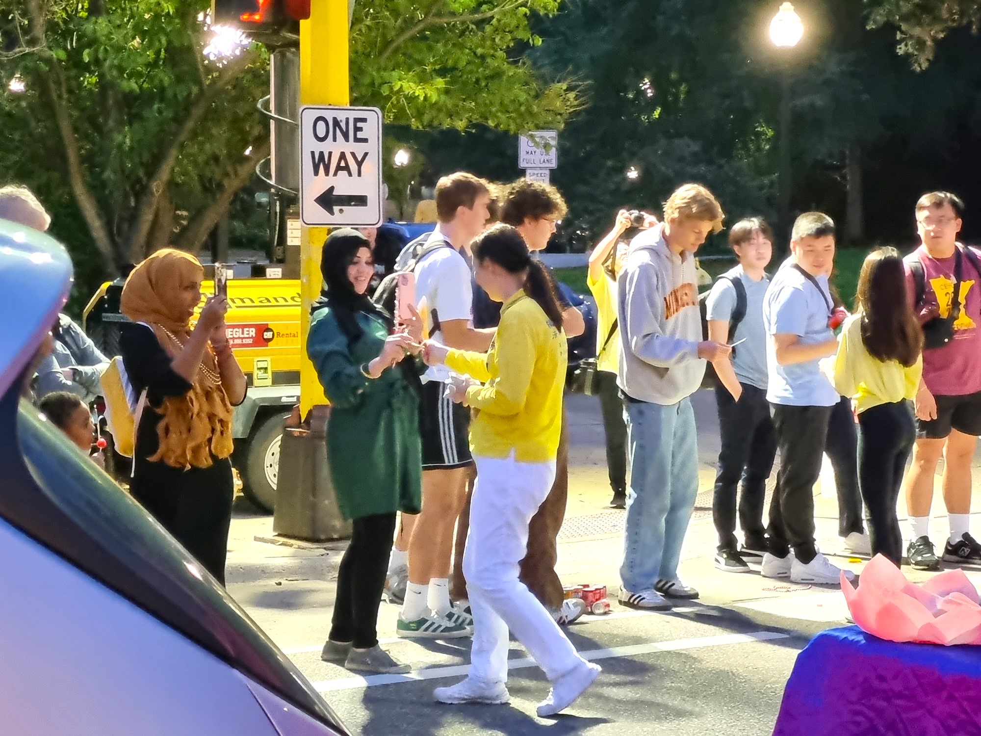 学员们都很高兴能有机会在中秋节聚在一起,并与校园内的师生和家长分享法轮大法的美好。