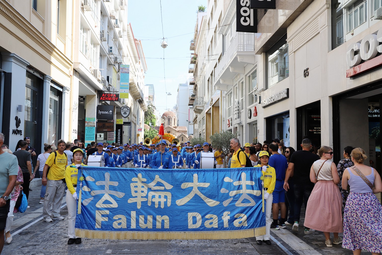 游行队伍由欧洲天国乐团引领,“法轮大法好”及呼吁停止迫害的队伍。线路由柯基亚广场(Kotzia Square)开始,经过著名的宪法广场(Syntagma square),名品购物街(Ermou Street),蒙纳斯提拉齐广场(Monastiraki square),瑟赛欧步行街(Thissio Street)。