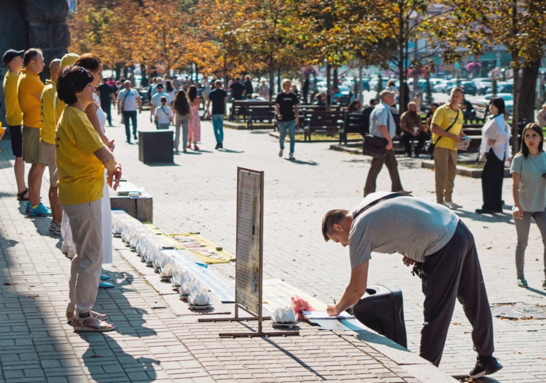 来自第聂伯的学员瓦伦蒂娜(Valentina)教路人学做纸莲花,莲花是纯洁善良的象征,很多乌克兰民众通过这种方式了解到法轮大法遭受的迫害。