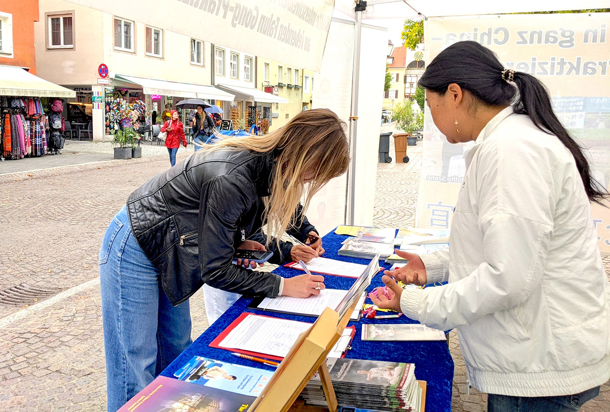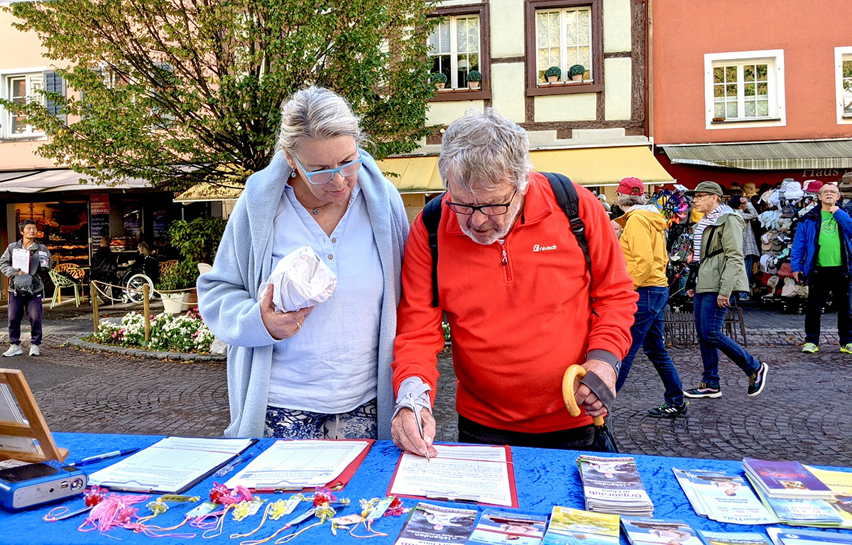 一对夫妻曾在德国菲森看过神韵演出,从中了解到中共活摘法轮功学员器官的情况,很震惊。他们看到法轮功学员的活动后,马上过来签名帮助制止中共迫害法轮功。