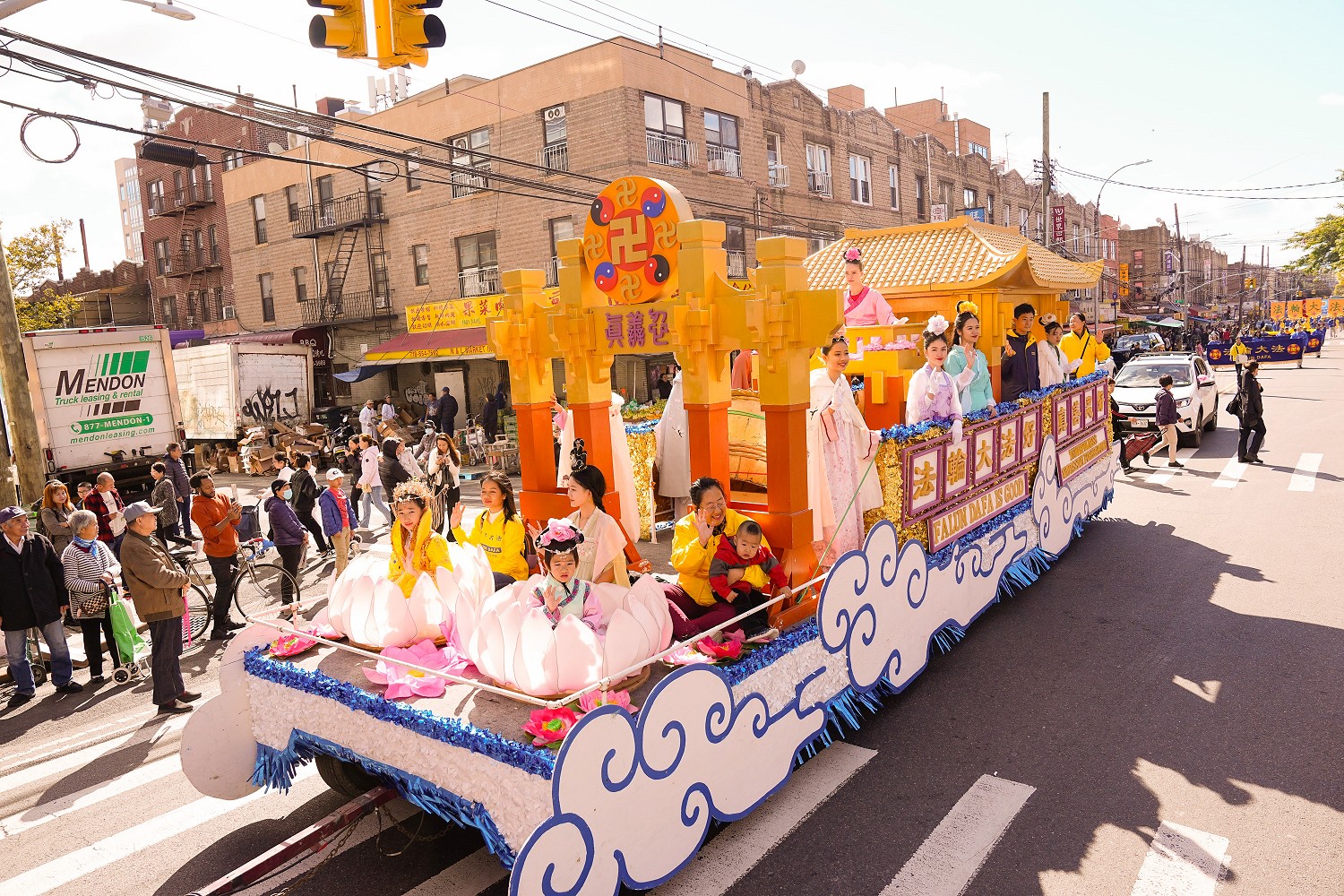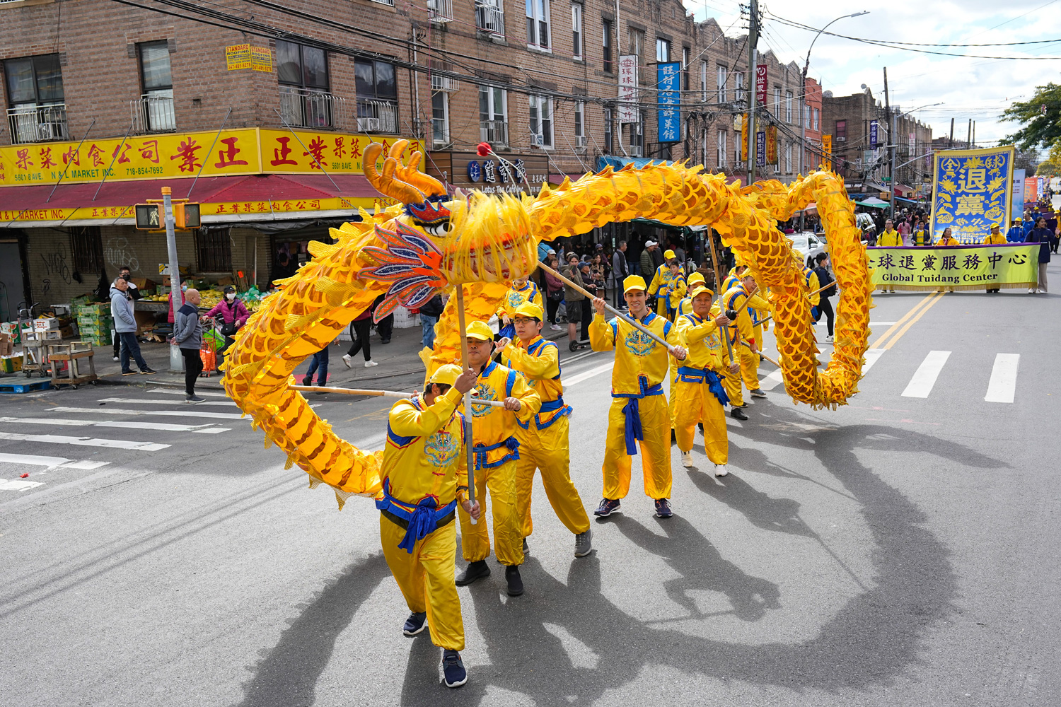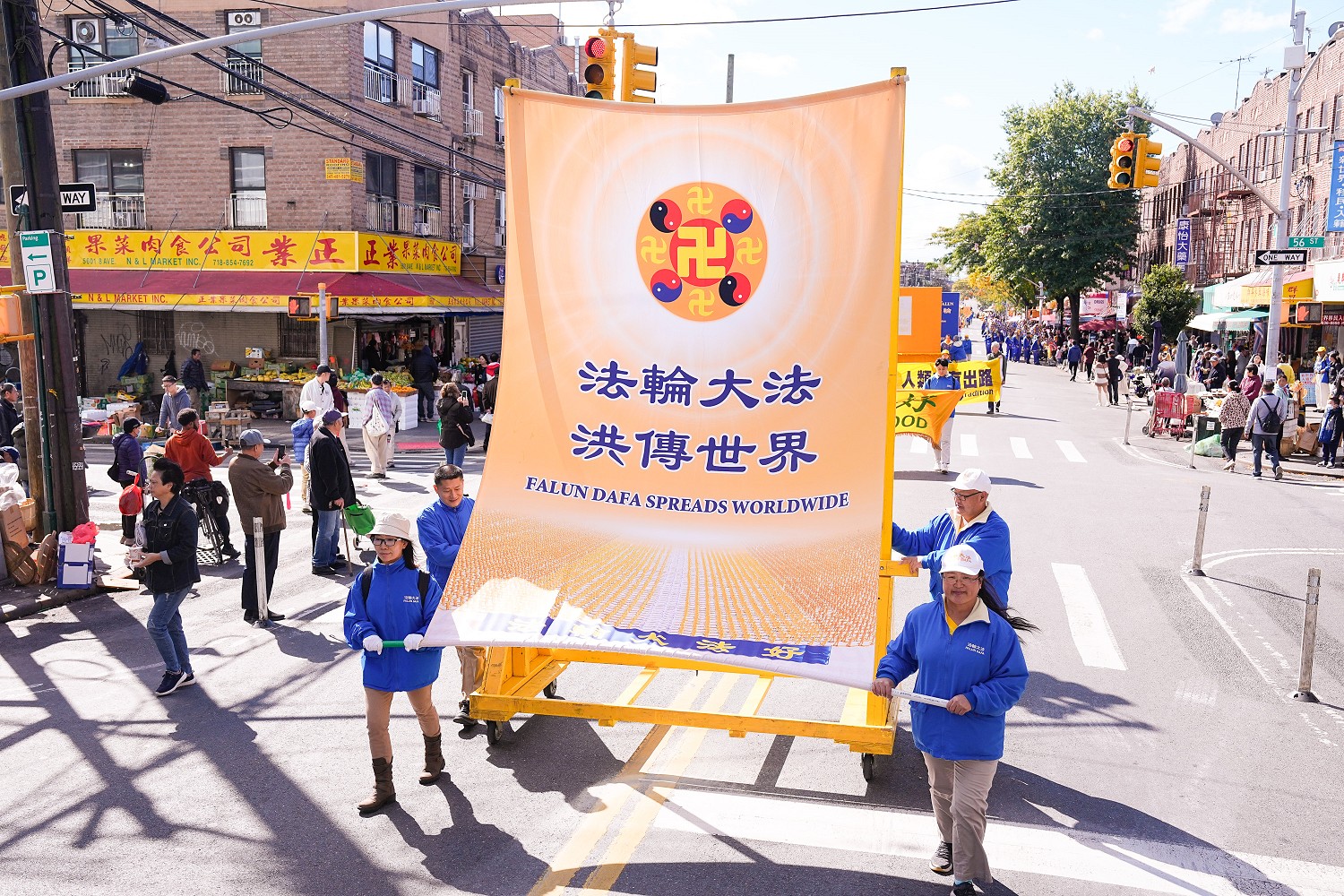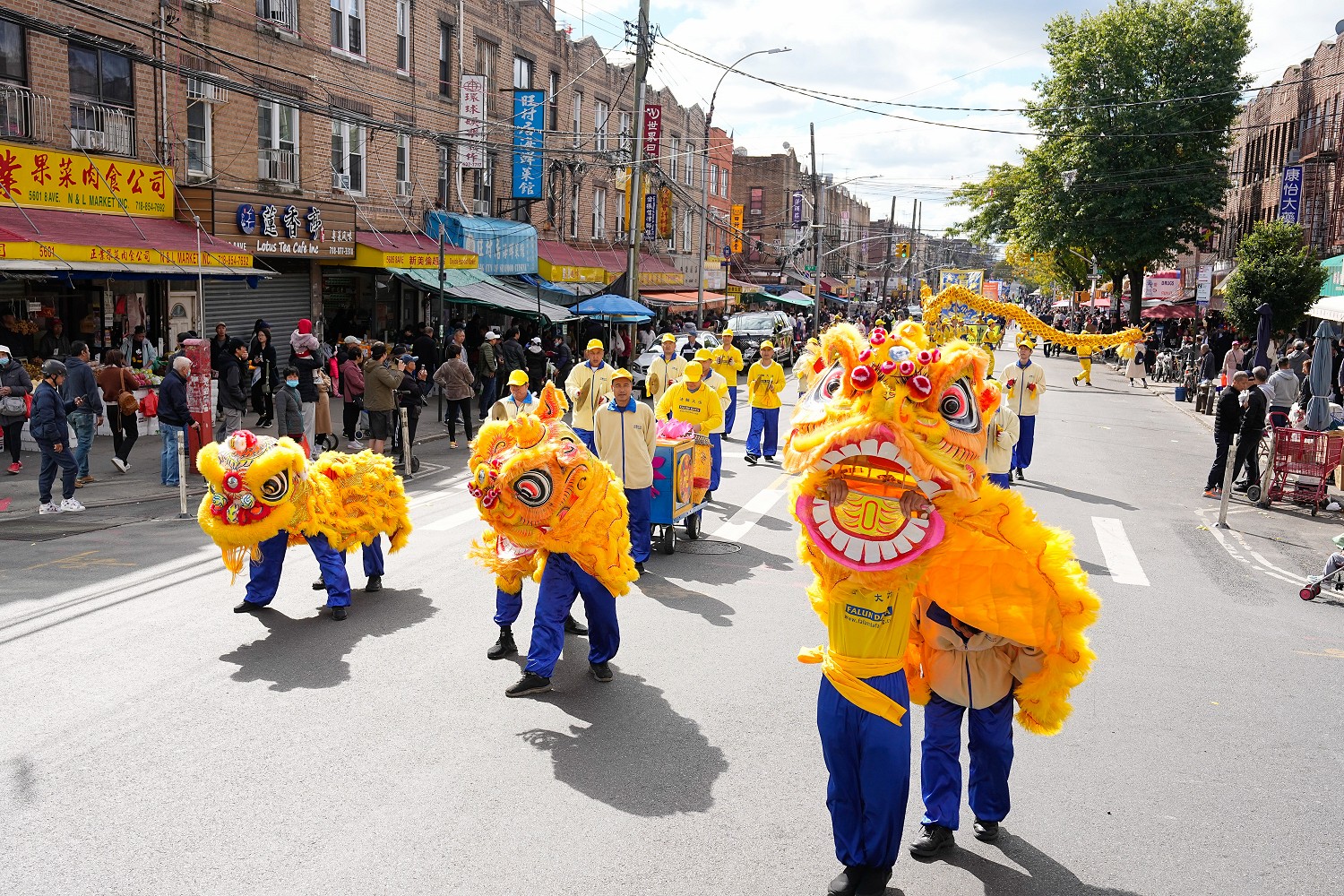 游行开始,布鲁克林八大道上,鼓声阵阵,旌旗招展,金龙飞舞,天国乐团响亮的鼓声传向四面八方。观看游行的路人挤满了十字路口,人们脸上流露着惊喜的表情和欢喜的笑容。
