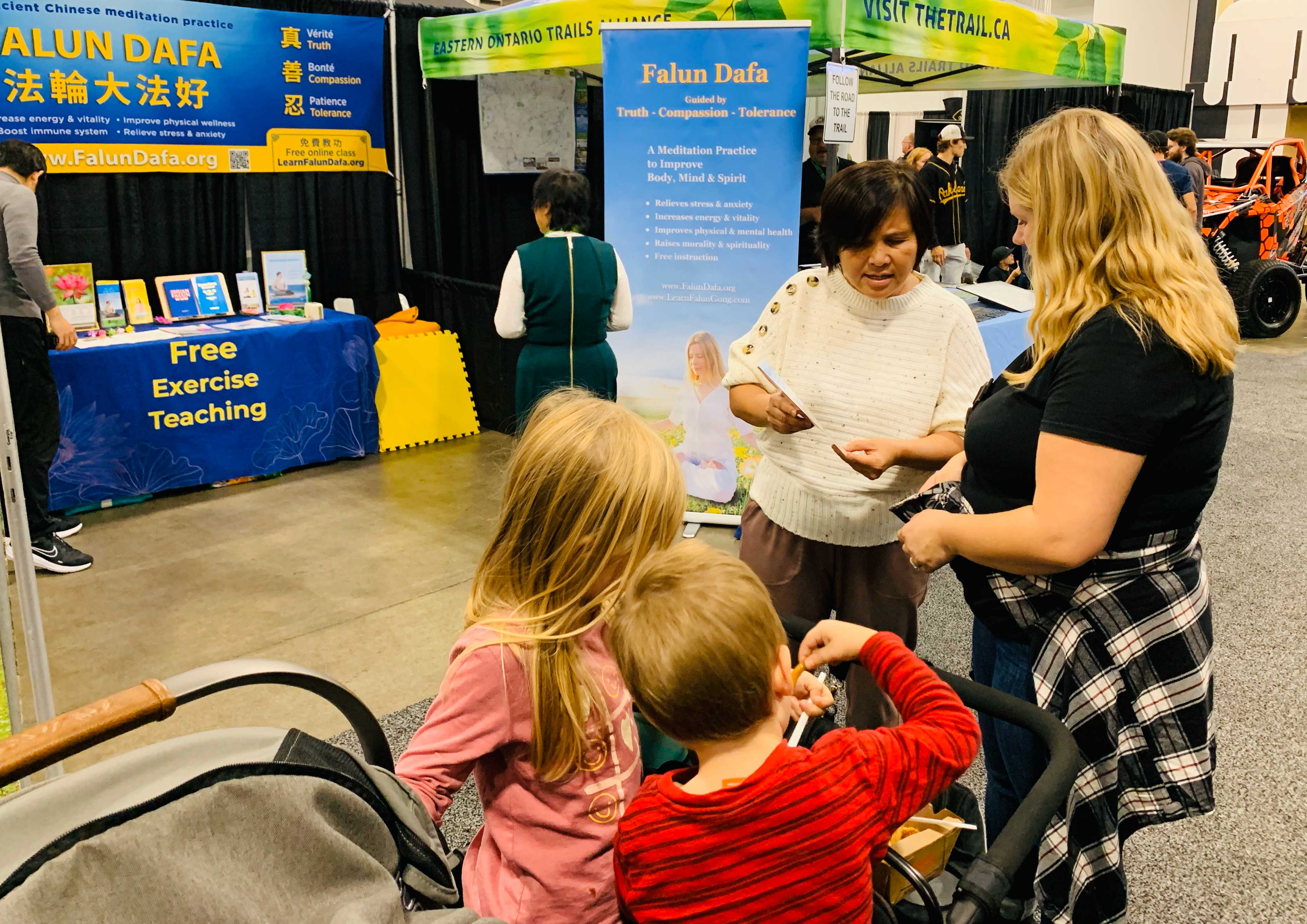 阿什莉(Ashley)带着三个孩子来到展位前。她的孩子们看到学员炼功的场面,停下来观看。学员向阿什莉和孩子们介绍的时候,孩子们想要学习,于是学员教了他们功法。