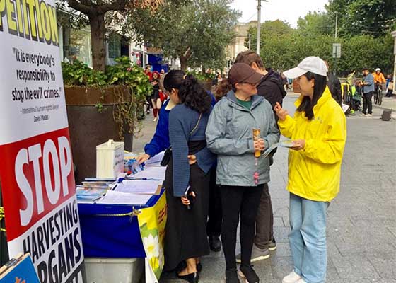 九月二十三日,法轮功学员在爱尔兰市中心真相。繁华的格拉夫顿大街有著名的购物商场,法轮功真相点就设立在商场的旁边。