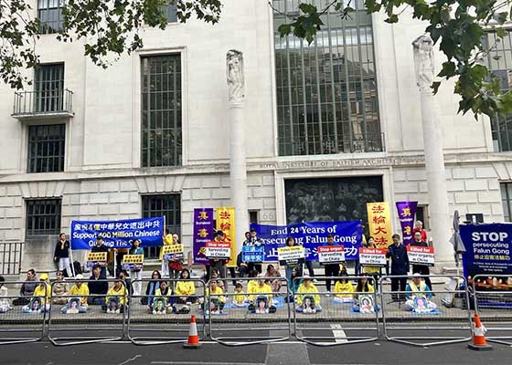 十月一日,法轮功学员在伦敦中使馆前举行和平抗议活动,谴责中共对法轮功长达二十四年的残酷迫害,呼吁中国人退出中共党、团、队等相关组织,三退保平安,给自己的生命选择美好的未来。