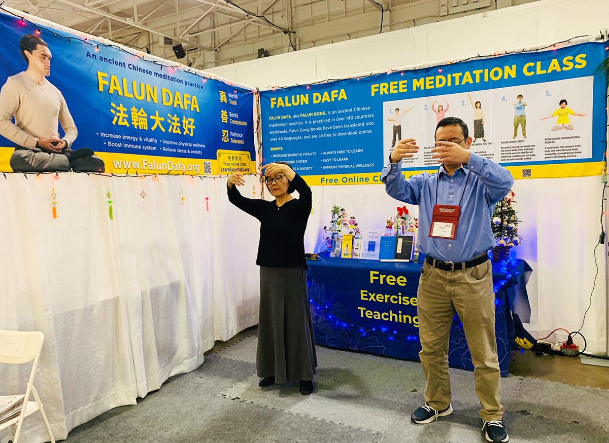 帕梅拉(Pamela)在展位上学了功。“我感觉真好。我想要一直学下去,直到掌握功法的要领,能够做出标准的手势和动作。因为我很享受炼功的过程,所以我还会告诉我的亲朋好友们,让他们也受益。感谢学员教我,这个功法非常好。”