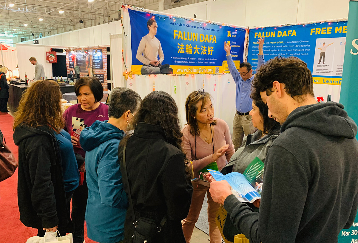 法轮功学员在活动上设立了展位,向来往的游客介绍功法的要领,并义务教给他们炼功的动作。看到学员递来的介绍传单,不少游客表示通过市区的真相点,或在其它活动的大法展位已经了解过大法。人们展现出对功法的兴趣,现场学炼了功法。其中有西人表示已经通过网络搜索,找到法轮大法,在家自学过。