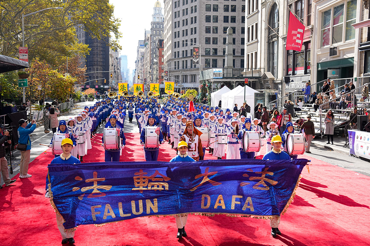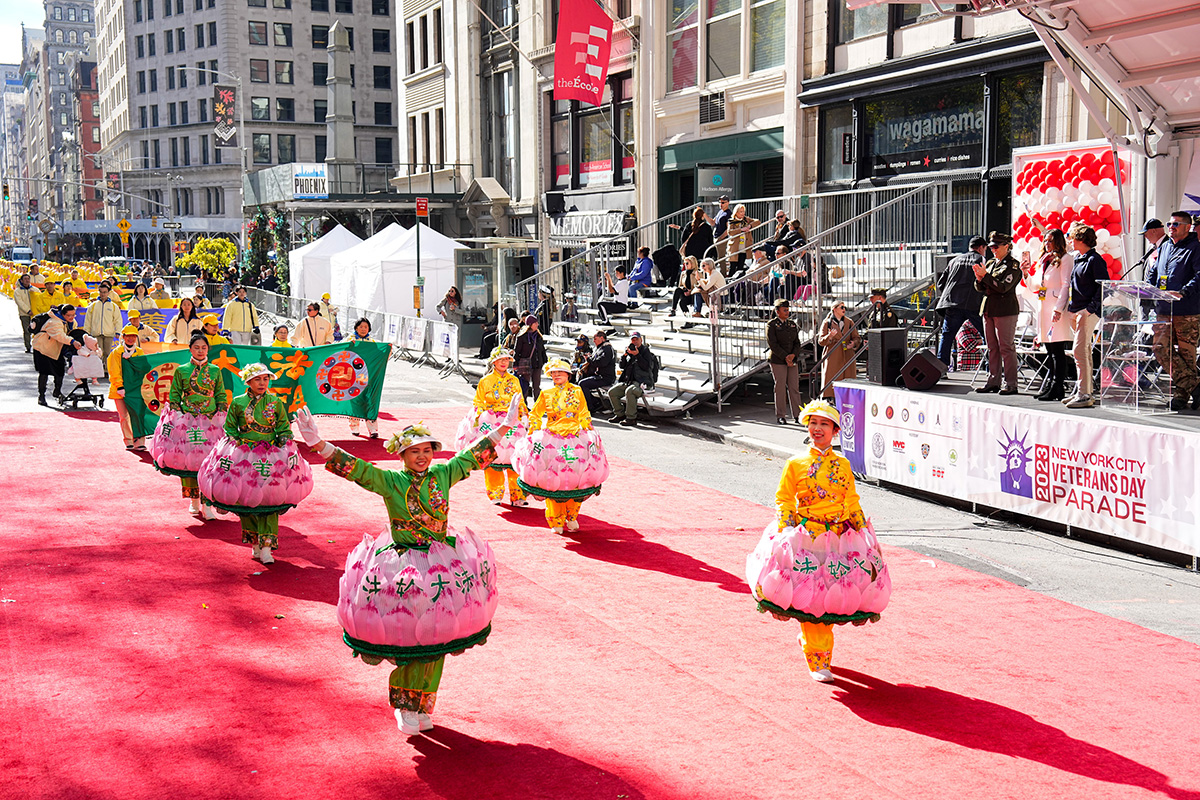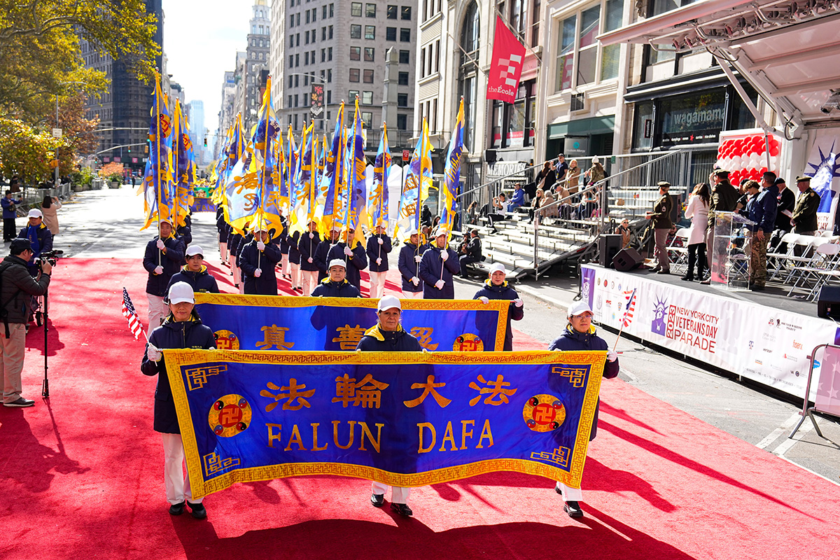 法轮大法团体每年均参加纽约市的退伍军人日游行,向老兵致敬。今年的方阵包括天国乐团、炼功队、彩旗队、花船队、莲花舞蹈队、腰鼓队、LED车等,队伍整齐、神采奕奕、多姿多彩,充满文化内涵,令人赏心悦目,向各界民众送上法轮大法的祝福,带去真、善、忍的美好,带去纯正的能量,也为游行增添光彩。