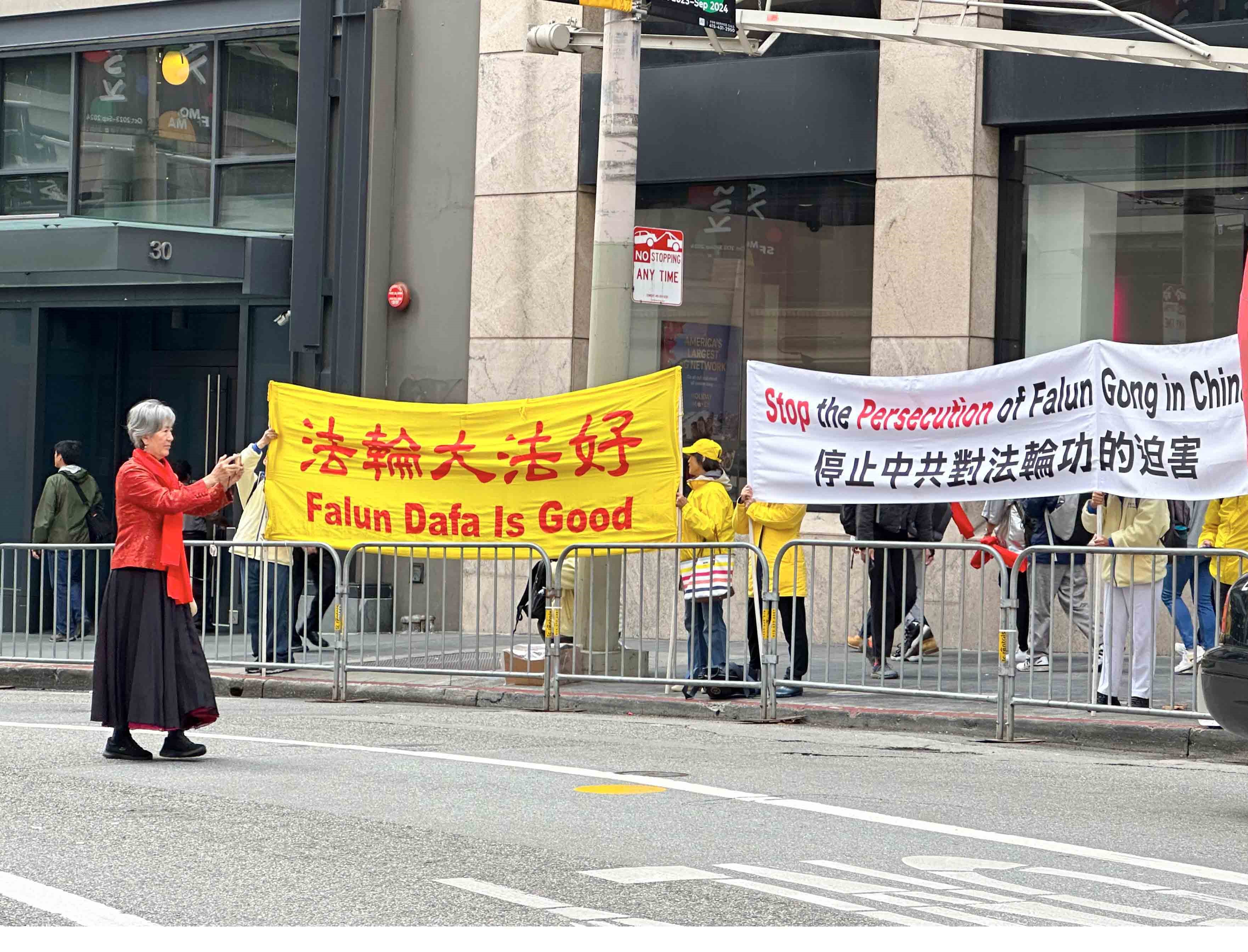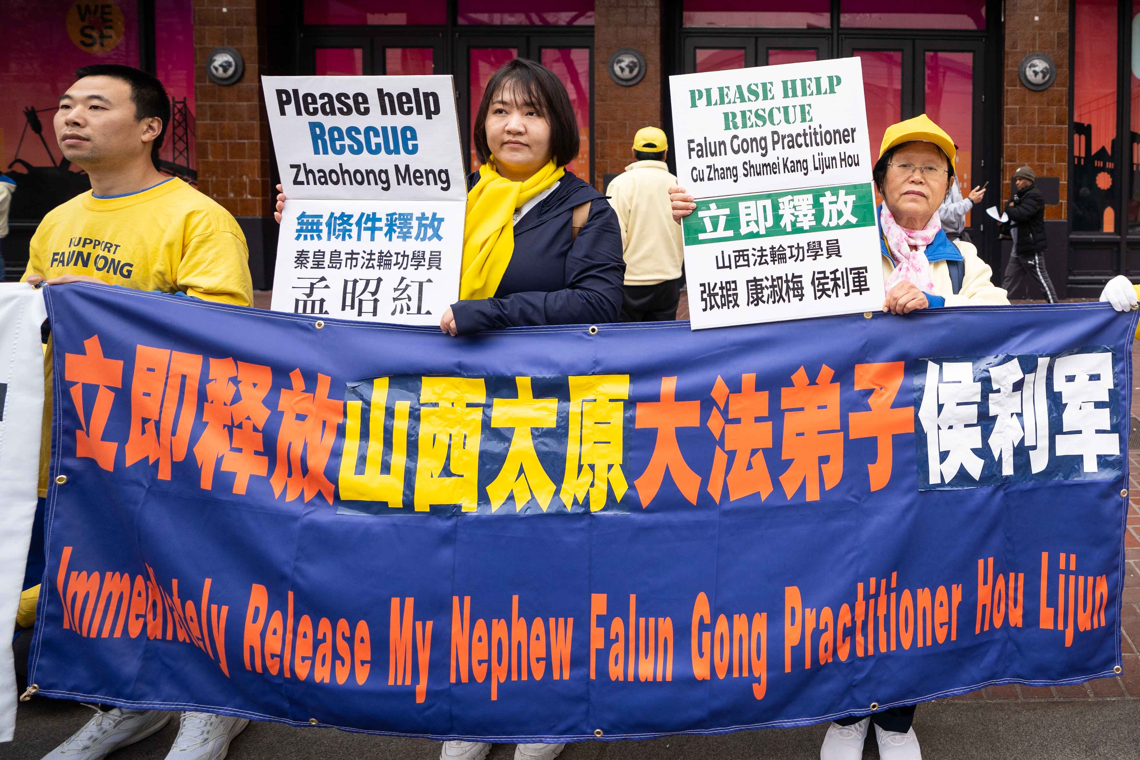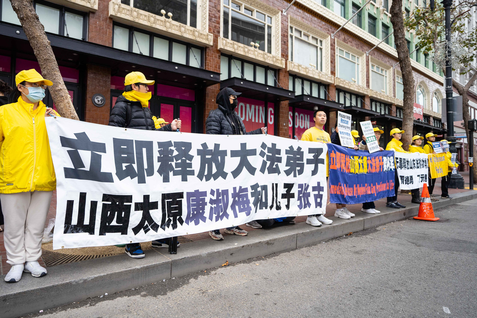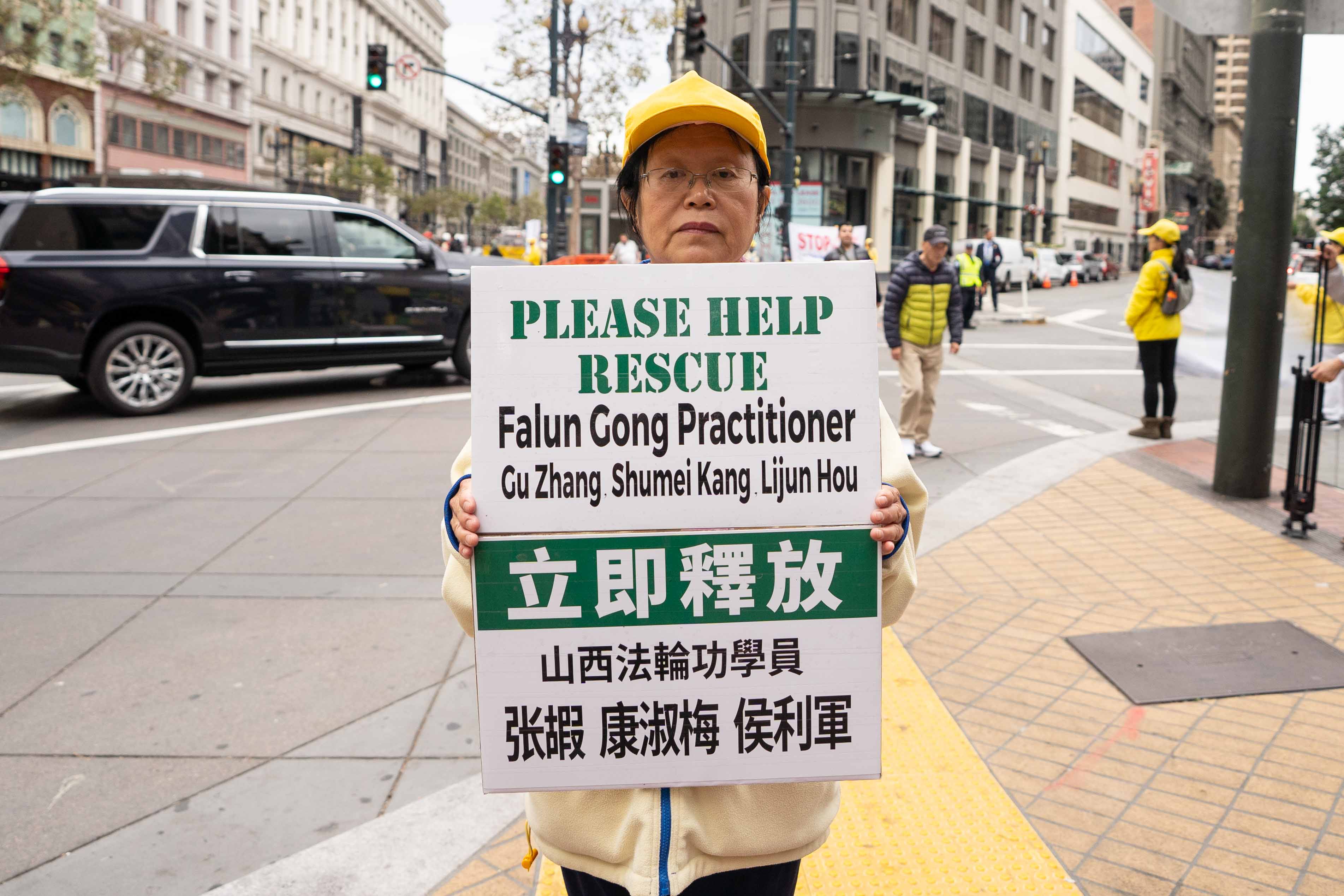 当天,洛杉矶法轮功学员康女士(Karen Kang)特地坐飞机来到旧金山,要求中共释放她在大陆被非法关押的亲人。
