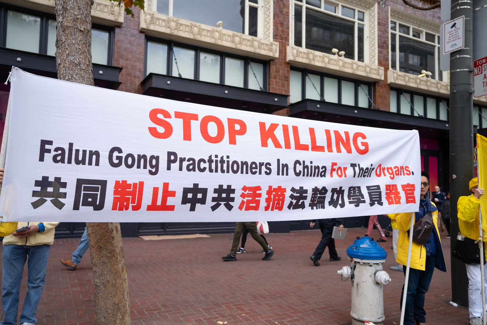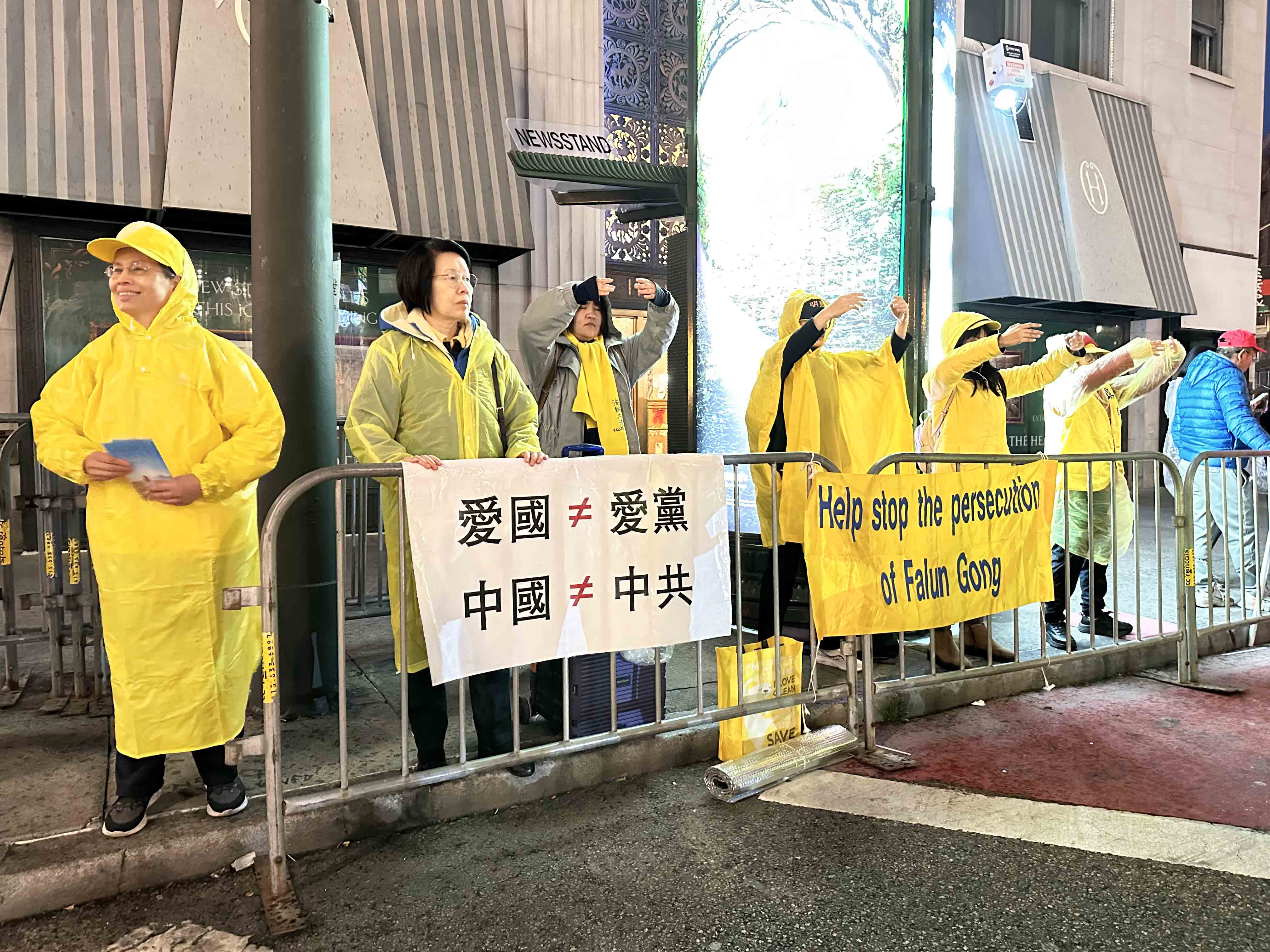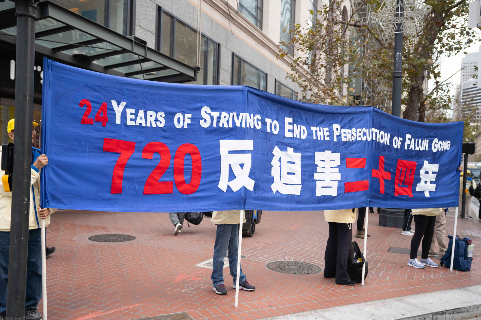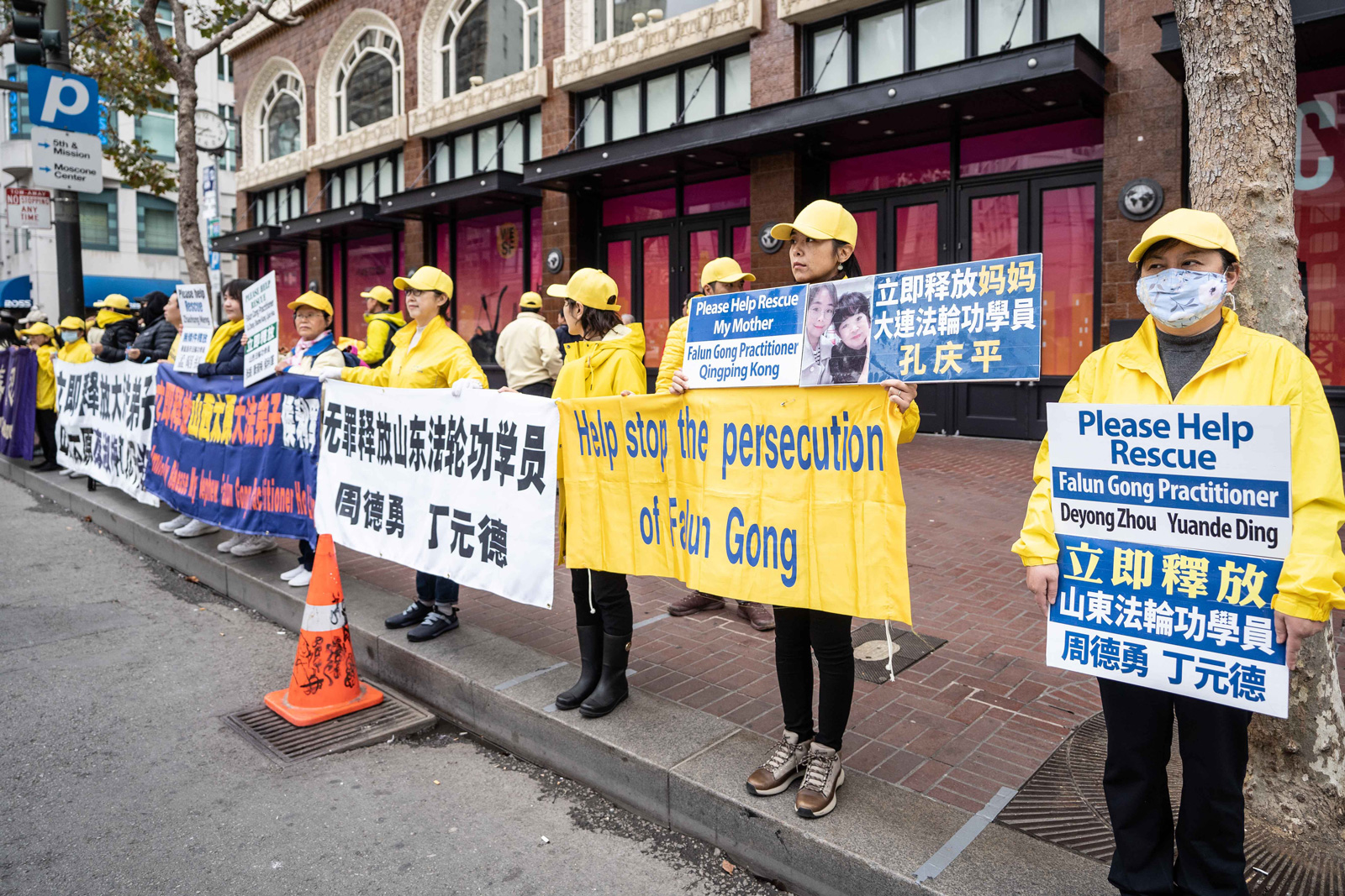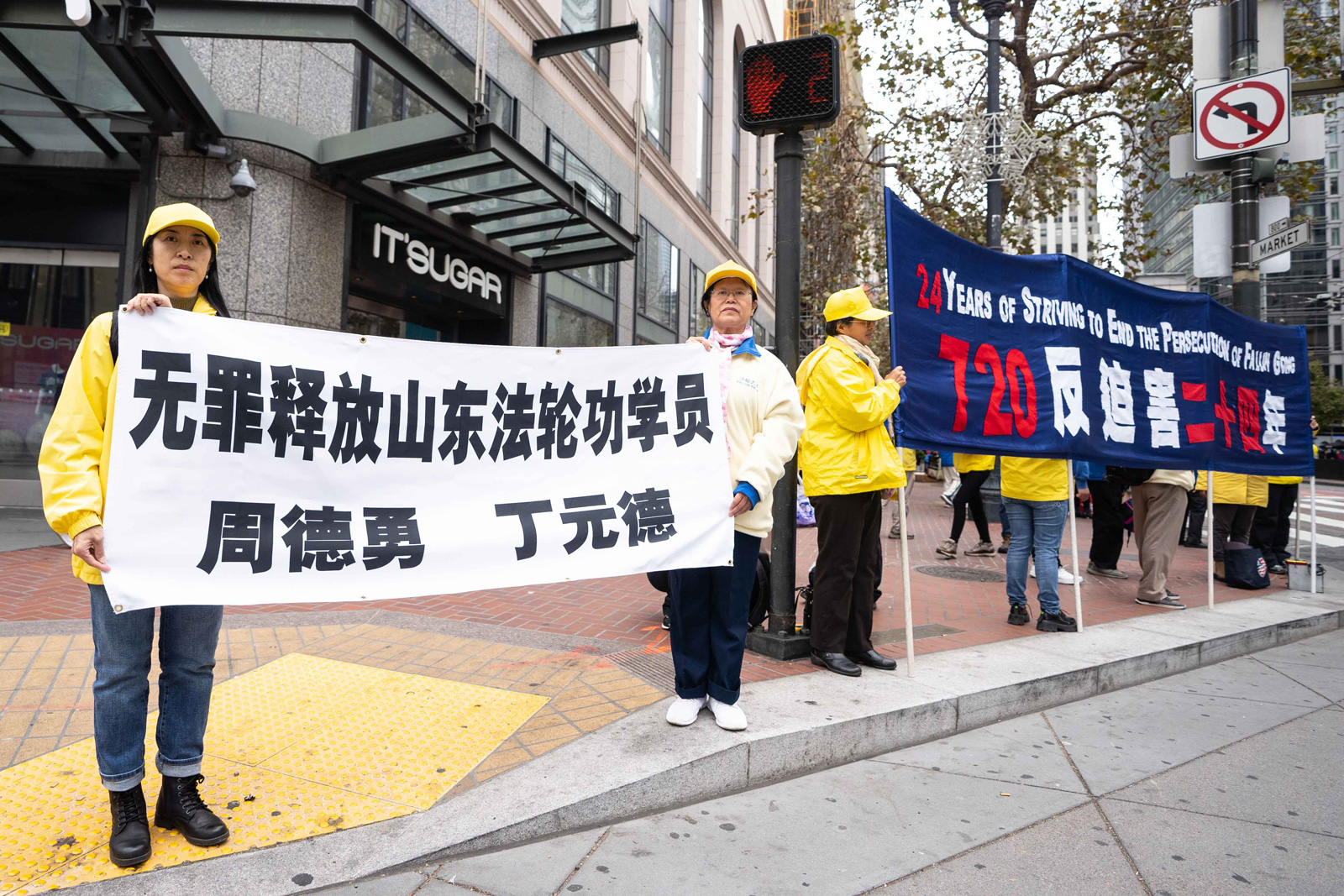 当天,洛杉矶法轮功学员康女士(Karen Kang)特地坐飞机来到旧金山,要求中共释放她在大陆被非法关押的亲人。