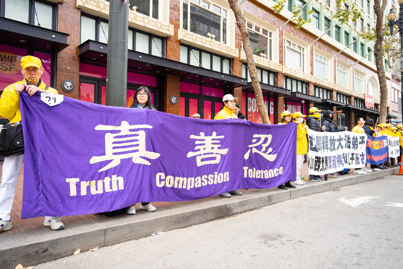 西藏人丹增·诺菲尔(Tenzin Norphel)也到旧金山抗议中共的暴行。他说:“我们支持法轮功学员。你们在做善事,我们应该支持你们。我支持真、善、忍,这是普世价值。”