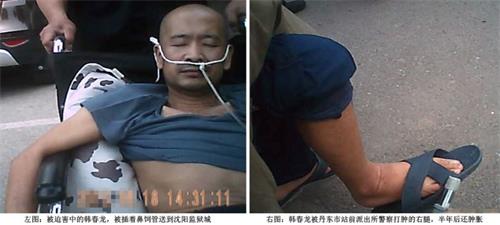 中共迫害法轮功,韩春龙多次被绑架、抄家,遭酷刑、刑讯逼供。被非法关押在丹东看守所期间,韩春龙的血压是191,心律是130,韩春龙被恶警打得耳朵听不见,右腿被打肿,两条腿明显一个粗一个细,走路一瘸一瘸的,前胸后背疼痛难忍。被确诊为:肾功不全;输尿管结石;双侧肾积水,合并感染;双肾结石;膀胱结石;尿路感染,膀胱痛,尿道痛。残酷的迫害使韩春龙生活不能自理,一直坐轮椅。在这种情况下还被丹东市振兴区检察院非法批捕,家属去检察院找,王学平检察长对着家属大喊大叫,还邪恶地说,判死刑才好呢。 二零一三年四月十二日法院对韩春龙非法开庭时,因为韩春龙和两位律师揭露公安机关非法造假、取证,打人的事实,韩春龙的两位北京律师被法官陶占华逐出法庭,律师对法官说:“你这样做不合适,是违法,是要承担责任的。” 法官陶占华却说:“不合适就不合适,违法就违法,承担责任就承担责任,共产党不倒台,我就永远不会承担责任。”过后,法官陶占华也无奈地说:“是610和政法委指使这么做的。”二零一三年五月三十一日,韩春龙被丹东市振兴区法院非法判刑四年。