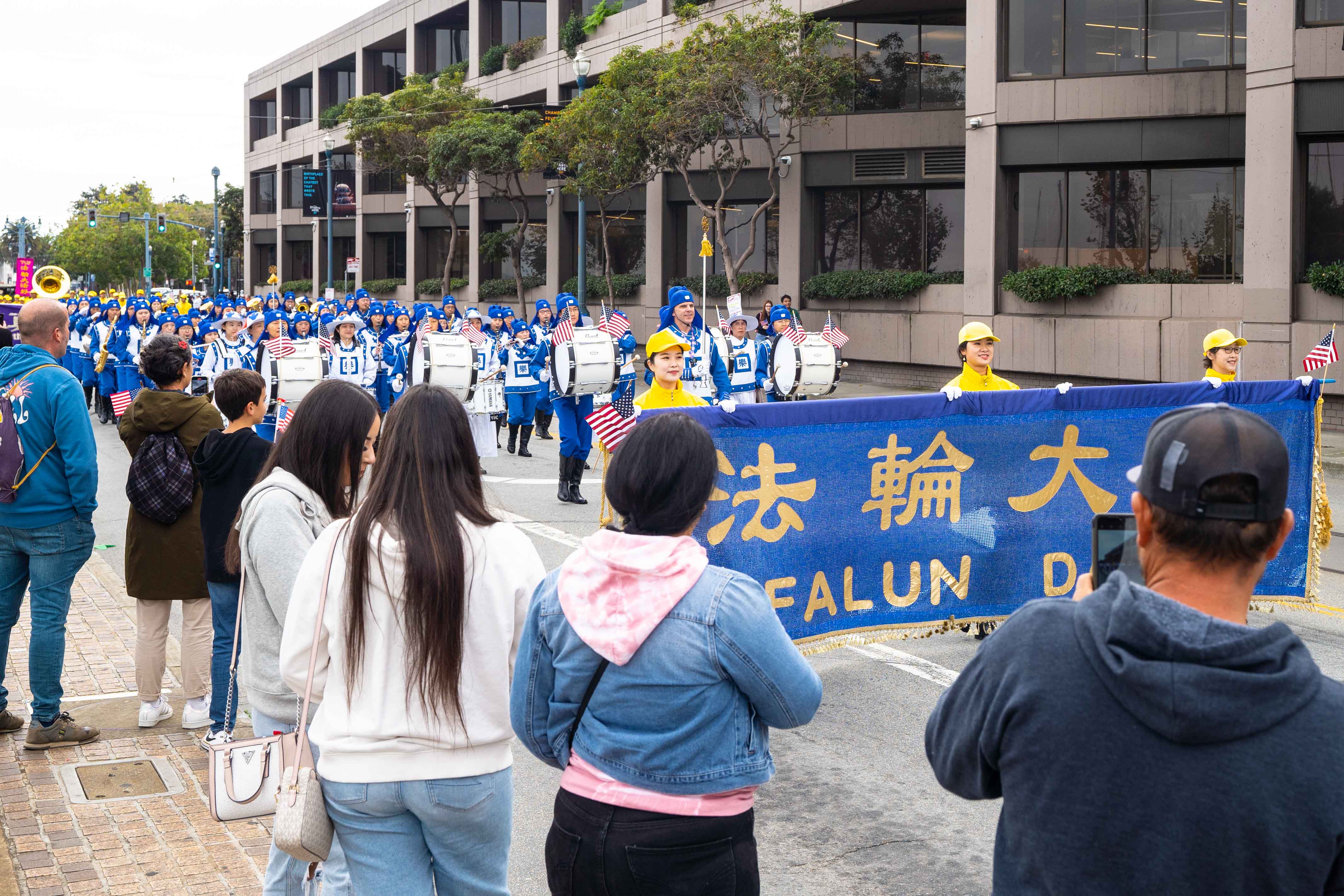 法轮功学员的队伍由美西天国乐团和炼功队组成。天国乐团为观众带来了《法轮大法好》和《美国国歌》等乐曲,受到观众的欢迎。有的观众看到法轮功学员的队伍热烈的鼓掌;有的挥手致意;有的随着天国乐团演奏的乐曲歌唱。美国军人听到天国乐团演奏的《美国国歌》时,伫立并行军礼。