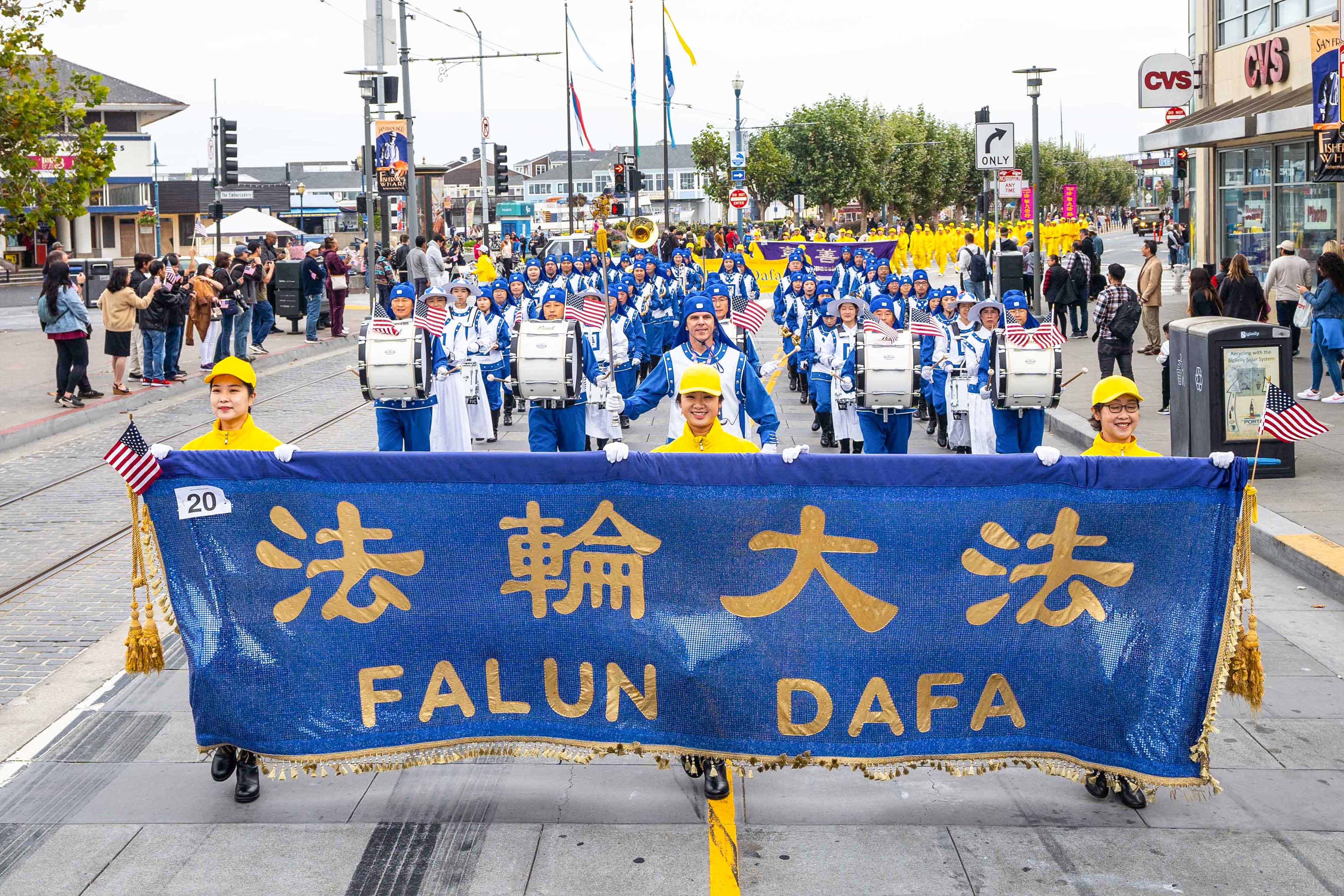 法轮功的队伍经过主席台时,主持人向观众介绍说:“现在来到主席台的是法轮大法天国乐团,我们不用介绍了,他们每年都来参加老兵节游行,并经常参加各地的游行。”