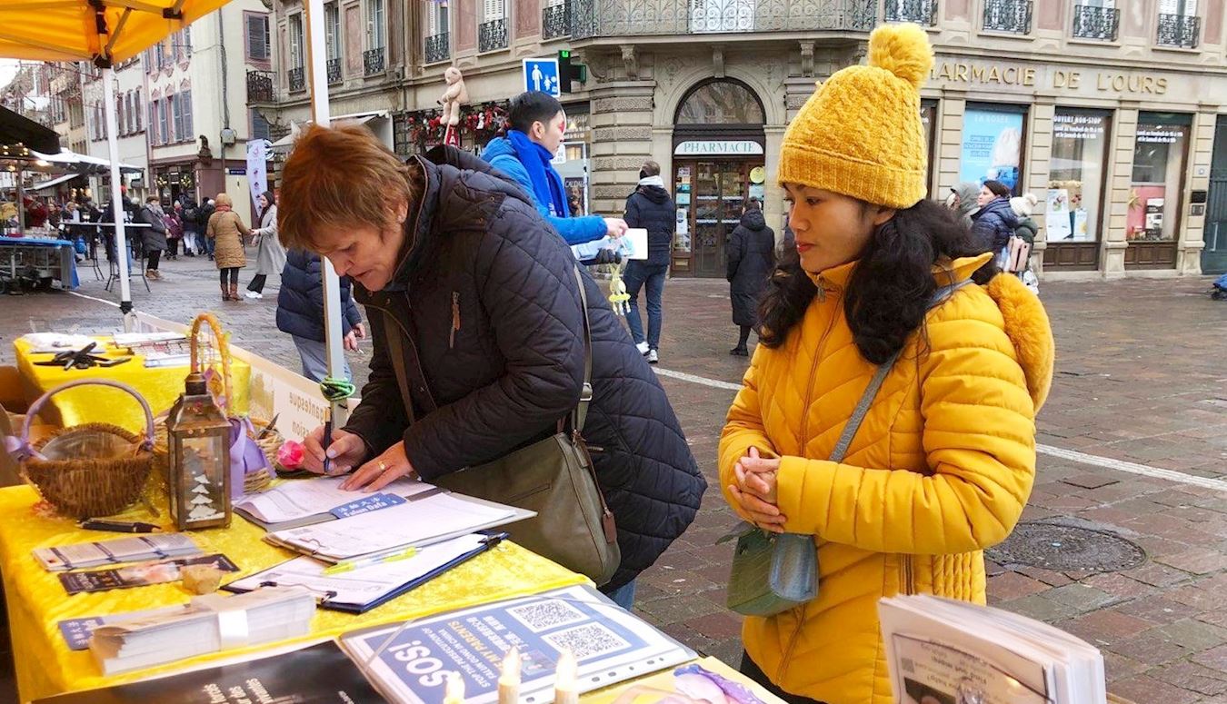 斯特拉斯堡圣诞市场是欧洲最古老的圣诞市场之一,每年有两百万人光顾。时值圣诞节前夕,到访者源源不断。许多人对中共活摘法轮功学员的器官感到震惊,他们纷纷签字支持学员的反迫害行动。人们在展位边驻足,说:“你们做得好,很勇敢,请继续努力!”还有的人当场学炼了法轮功五套功法。