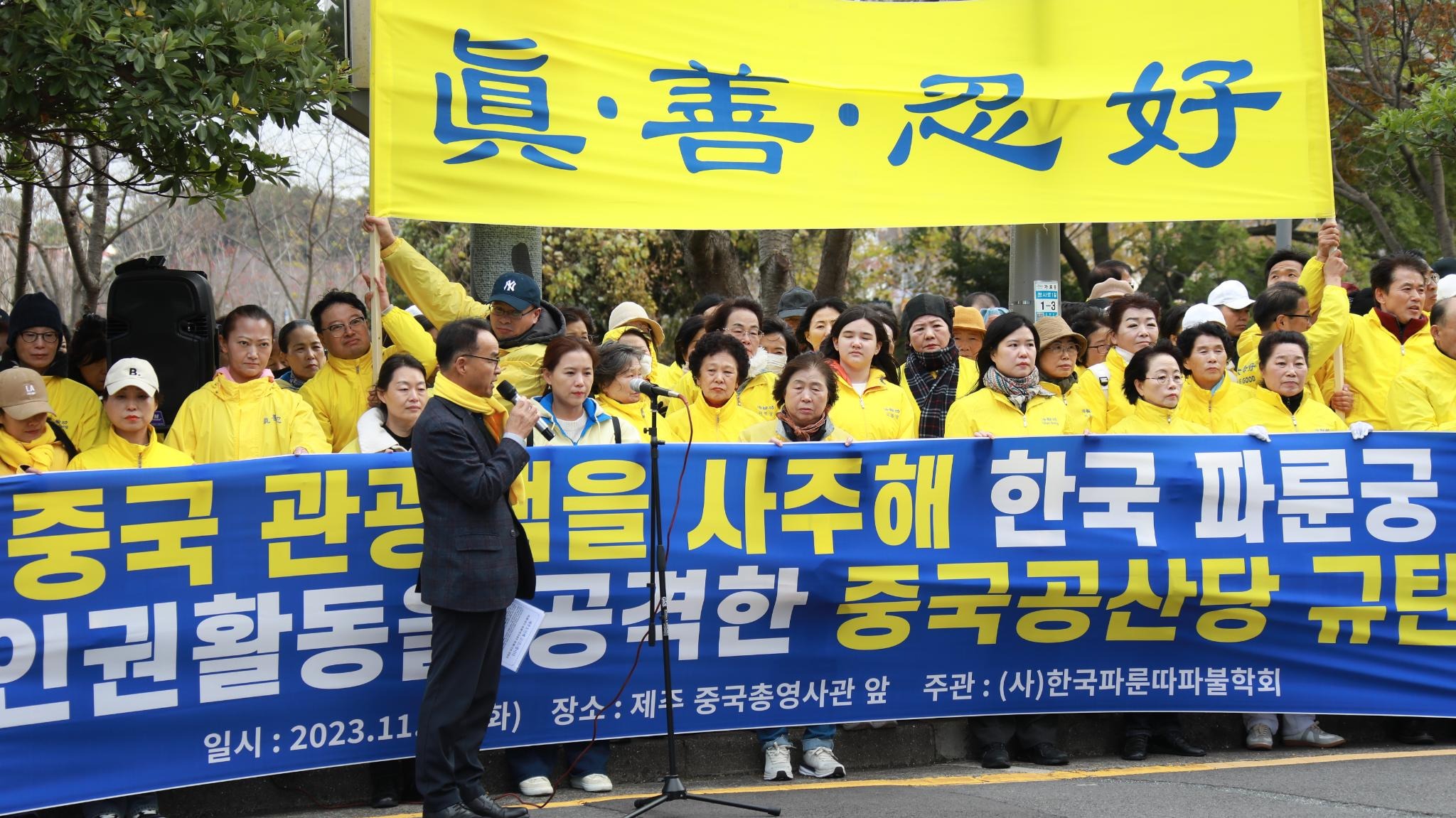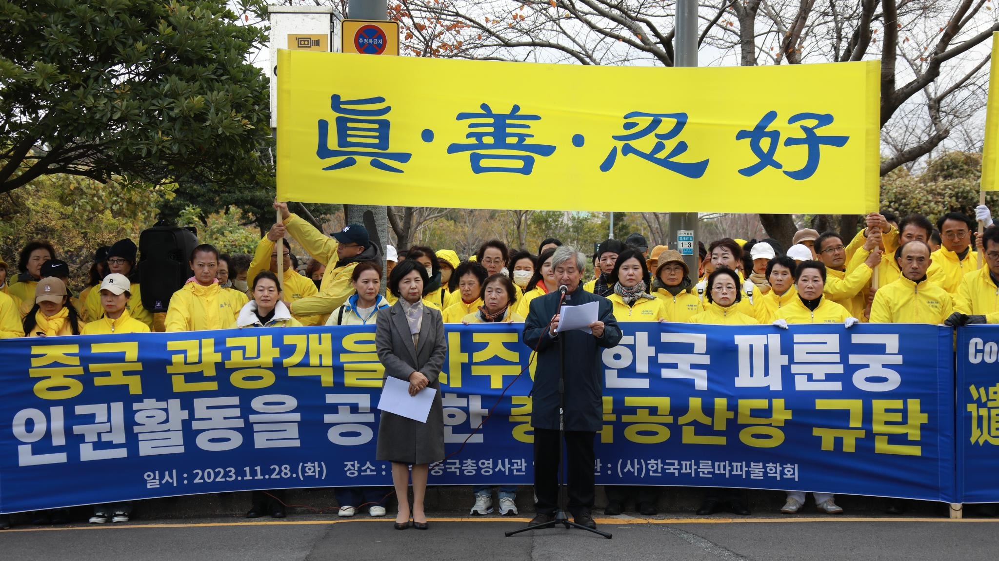 二零二三年十一月二十八日星期四,韩国法轮大法佛学会在驻济州中国总领馆前举行了新闻发布会。学会在现场发布的声明书中要求中国大使就此事件正式道歉,同时敦促韩国政府采取措施以防止类似事件再次发生。