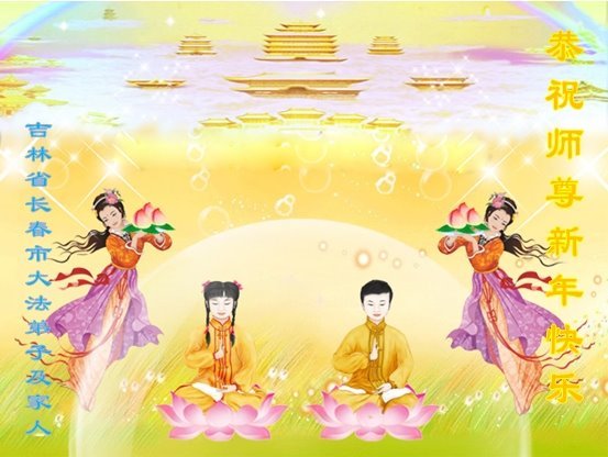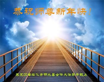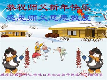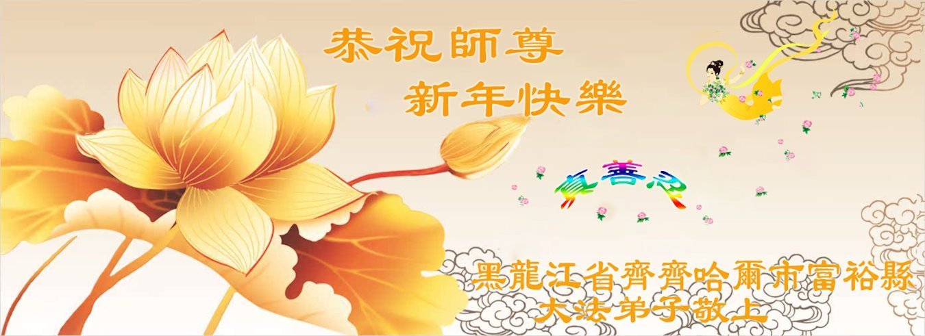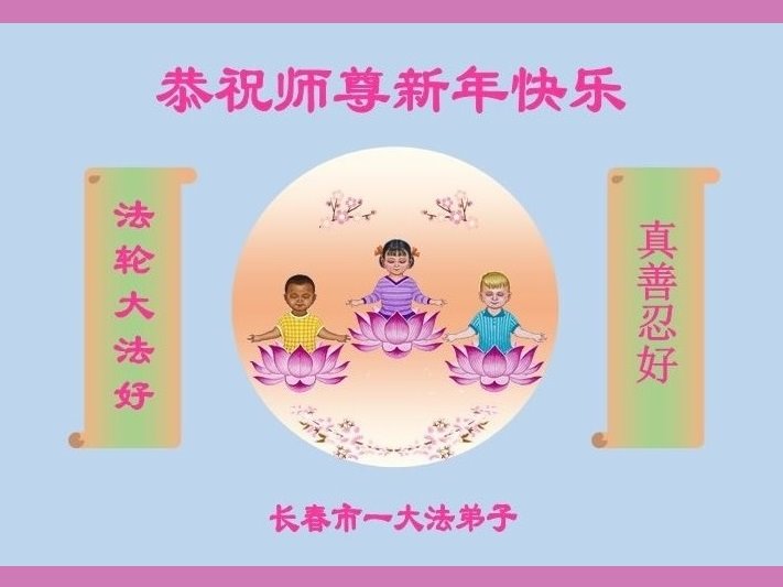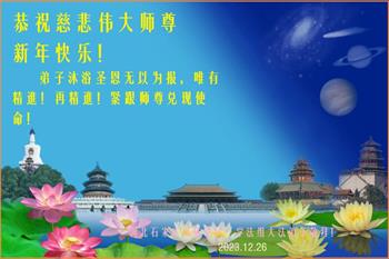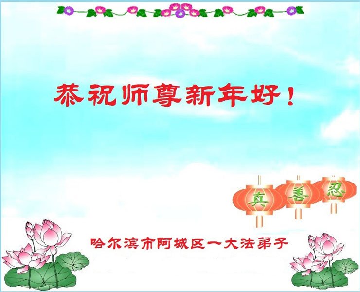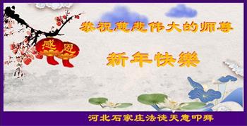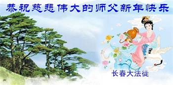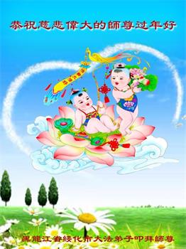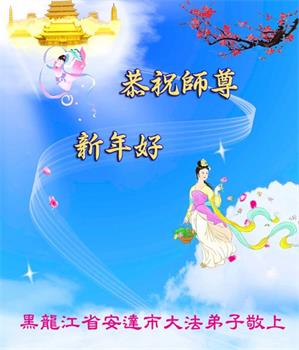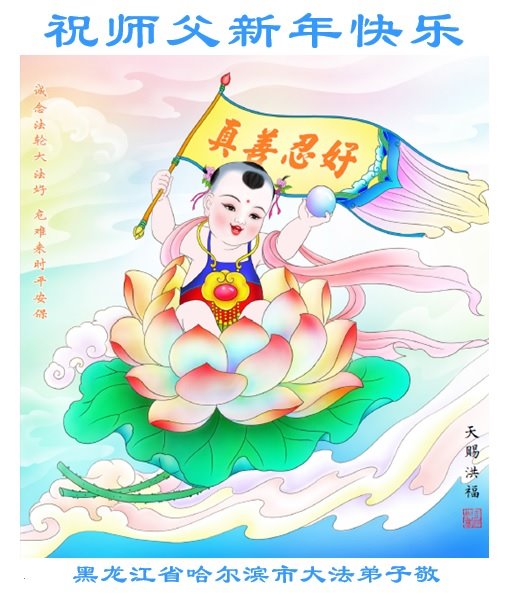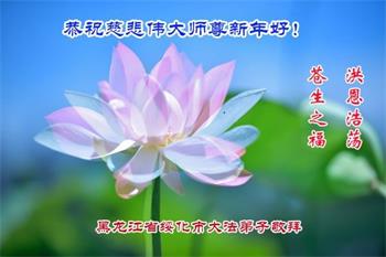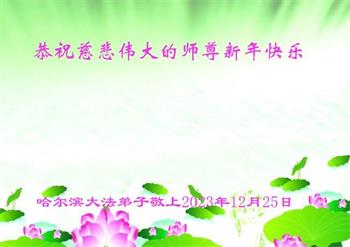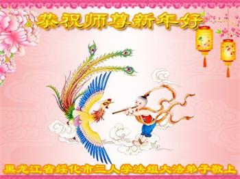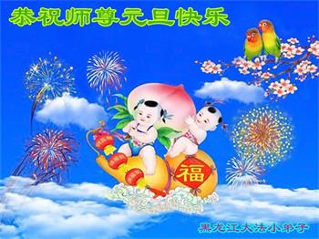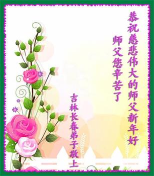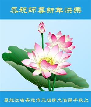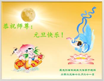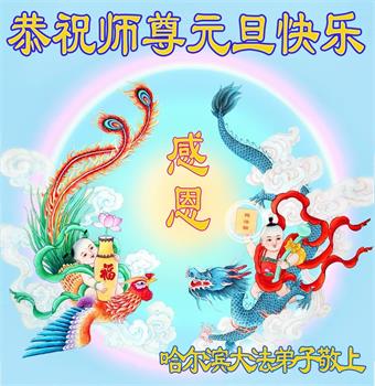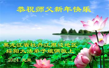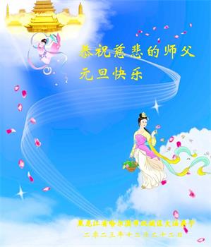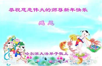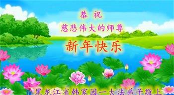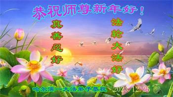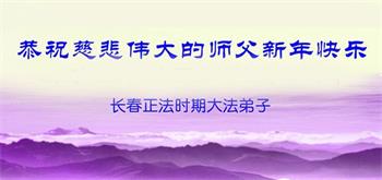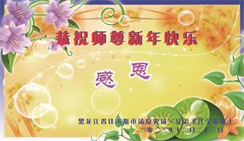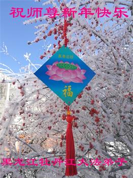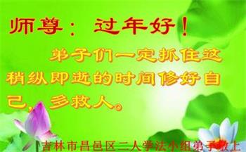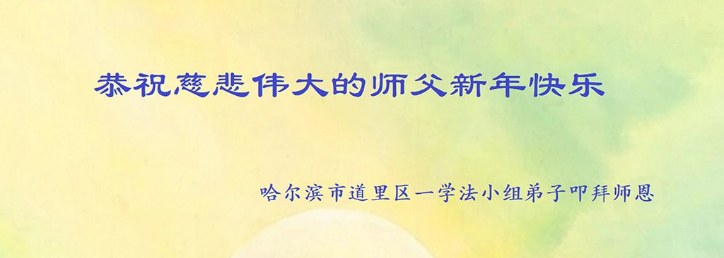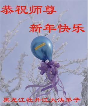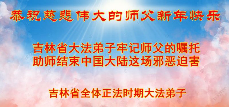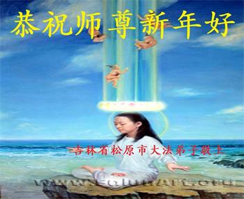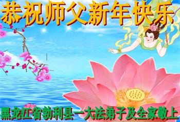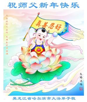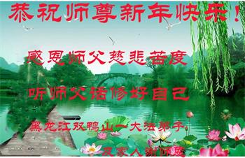 黑龙江省公安系统大法弟子在贺词中表示:“二十五年修炼的风风雨雨,弟子们都坚持下来了。请师父放心,在新的一年,弟子们一定会做的更好,勇猛精進,助师正法。”