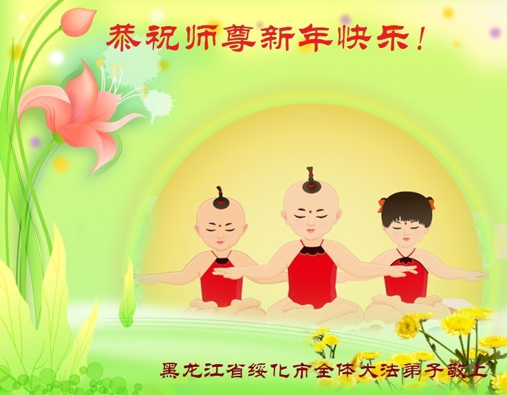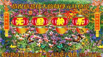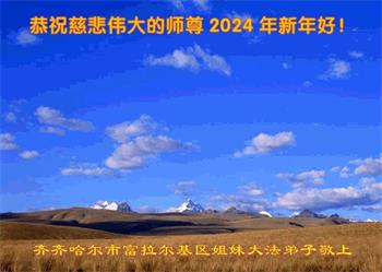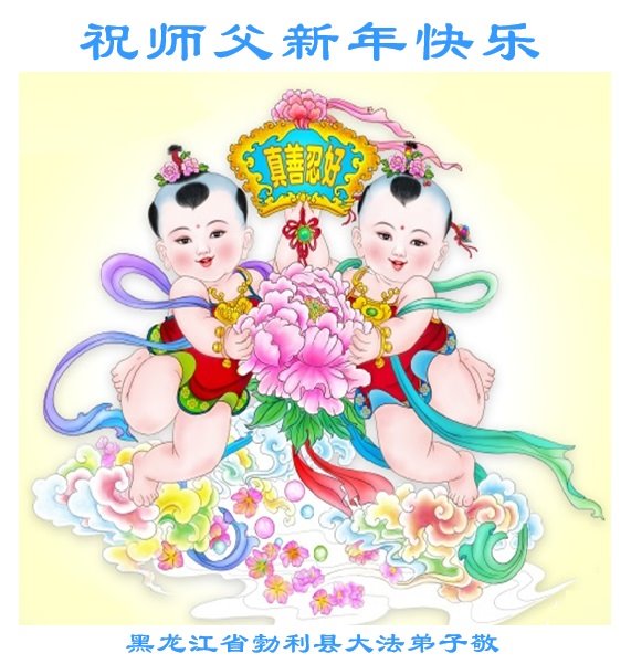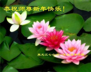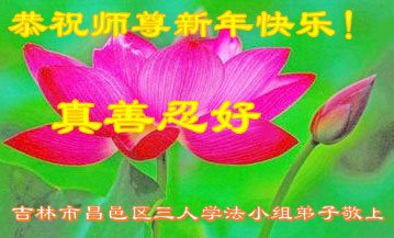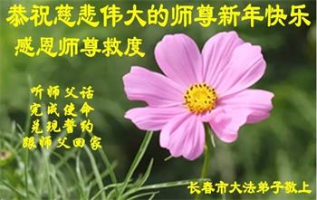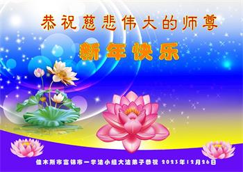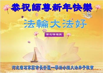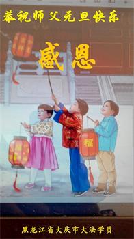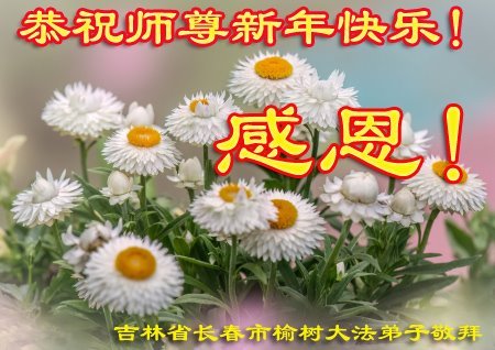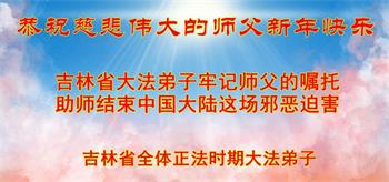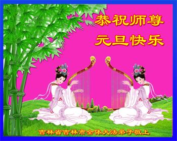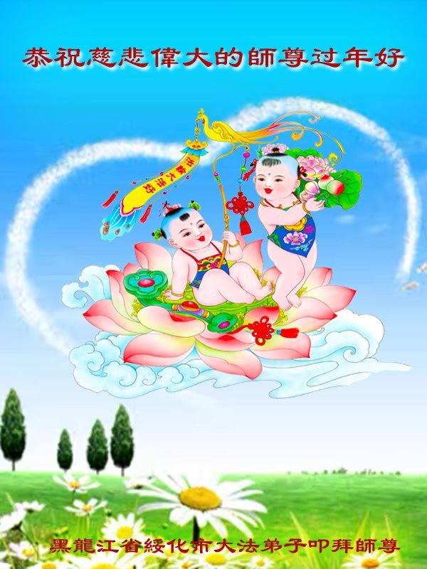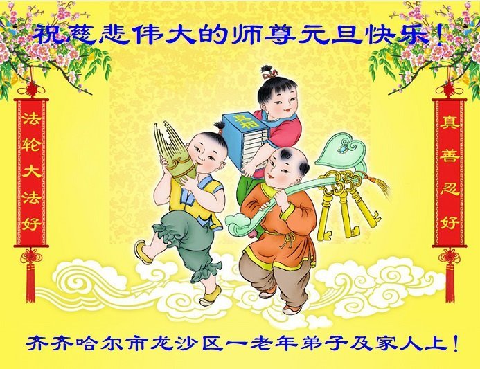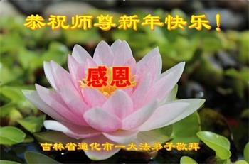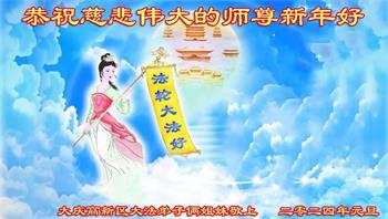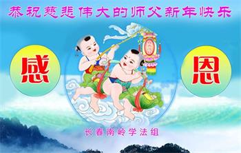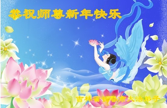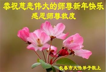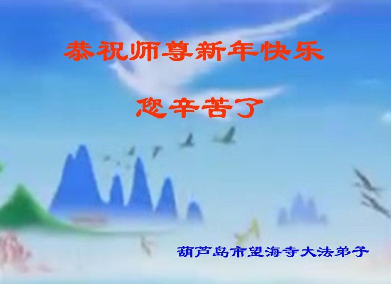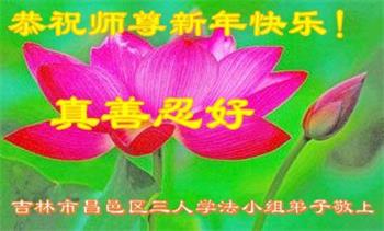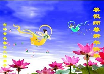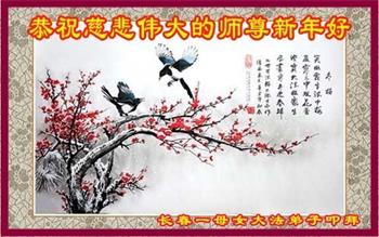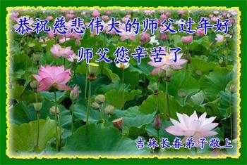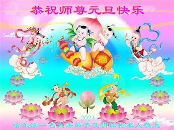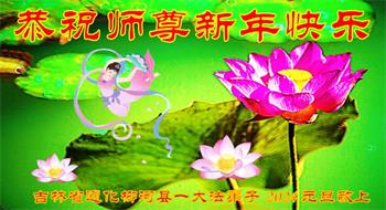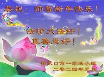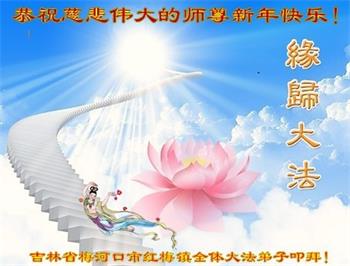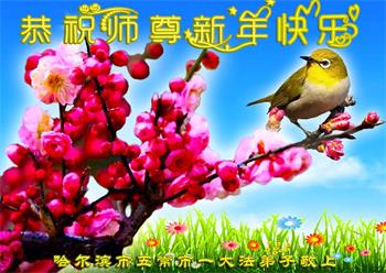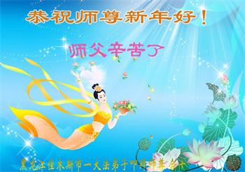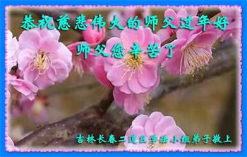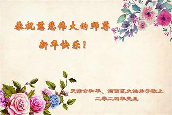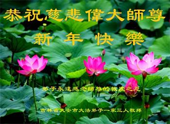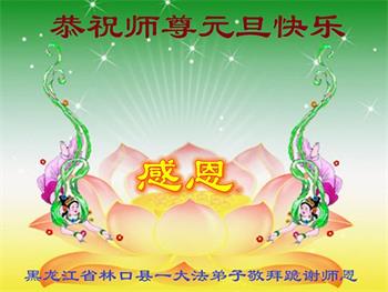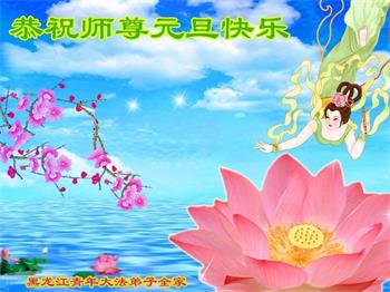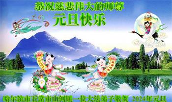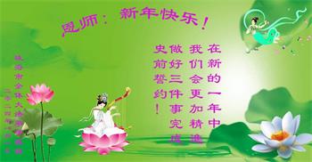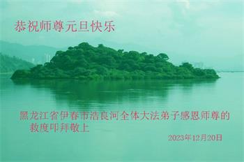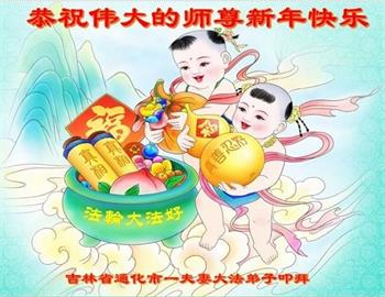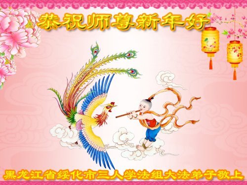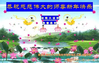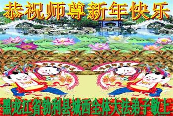 黑龙江省公安系统大法弟子在贺词中表示:“二十五年修炼的风风雨雨,弟子们都坚持下来了。请师父放心,在新的一年,弟子们一定会做的更好,勇猛精進,助师正法。”